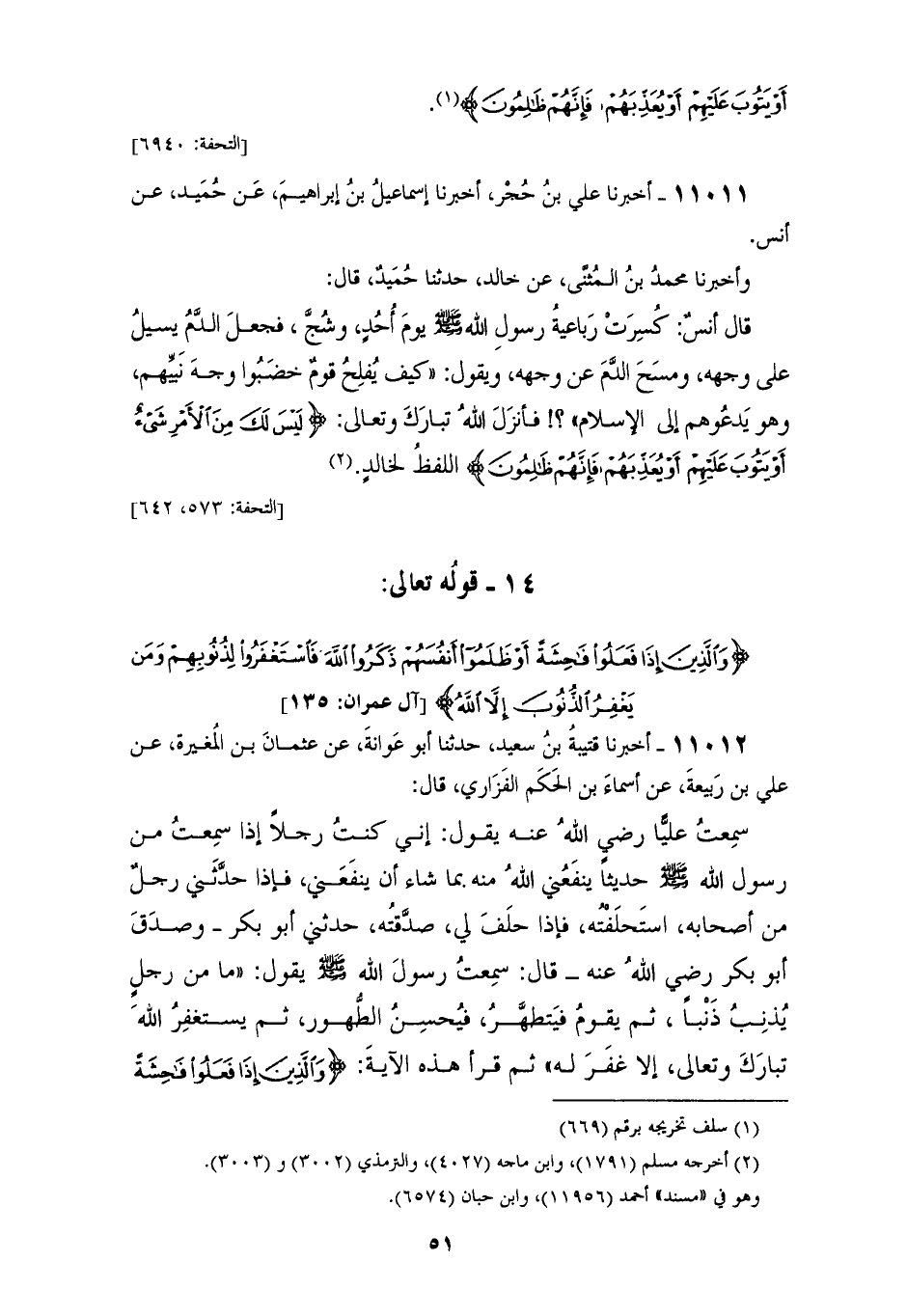 11011 - أَخْبَرَنَا عَلِيُّ بْنُ حُجْرٍ، أَخْبَرَنَا إِسْمَاعِيلُ بْنُ إِبْرَاهِيمَ، عَنْ حُمَيْدٍ، عَنْ أَنَسٍ، وَأَخْبَرَنَا مُحَمَّدُ بْنُ الْمُثَنَّى، عَنْ خَالِدٍ، حَدَّثَنَا حُمَيْدٌ، قَالَ: قَالَ أَنَسٌ: كُسِرَتْ رَبَاعِيَةُ رَسُولِ اللهِ صَلَّى اللهُ عَلَيْهِ وَسَلَّمَ يَوْمَ أُحُدٍ وَشُجَّ، فَجَعَلَ الدَّمُ يَسِيلُ عَلَى وَجْهِهِ، وَمَسَحَ الدَّمَ عَنْ وَجْهِهِ وَيَقُولُ: «§كَيْفَ يُفْلِحُ قَوْمٌ خَضَبُوا وَجْهَ نَبِيِّهِمْ وَهُوَ يَدْعُوهُمْ إِلَى الْإِسْلَامِ؟» فَأَنْزَلَ اللهُ تَبَارَكَ وَتَعَالَى {لَيْسَ لَكَ مِنَ الْأَمْرِ شَيْءٌ أَوْ يَتُوبَ عَلَيْهِمْ أَوْ يُعَذِّبَهُمْ فَإِنَّهُمْ ظَالِمُونَ} [آل عمران: 128] اللَّفْظُ لِخَالِدٍ