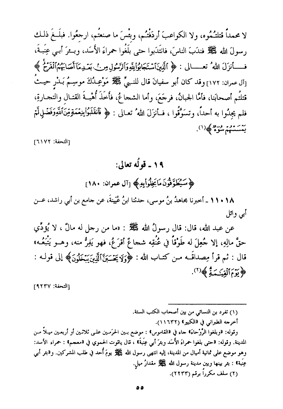 11018 - أَخْبَرَنَا مُجَاهِدُ بْنُ مُوسَى، حَدَّثَنَا ابْنُ عُيَيْنَةَ، عَنْ جَامِعِ بْنِ أَبِي رَاشِدٍ، عَنْ أَبِي وَائِلٍ، عَنْ عَبْدِ اللهِ، قَالَ: قَالَ رَسُولُ اللهِ صَلَّى اللهُ عَلَيْهِ وَسَلَّمَ: «§مَا مِنْ رَجُلٍ لَهُ مَالٌ لَا يُؤَدِّي حَقَّ مَالِهِ إِلَّا جُعِلَ لَهُ طَوْقًا فِي عُنُقِهِ شُجَاعٌ أَقْرَعُ فَهُوَ يَفِرُّ مِنْهُ وَهُو يَتْبَعُهُ» قَالَ: ثُمَّ قَرَأَ مِصْدَاقَهُ مِنْ كِتَابِ اللهِ {وَلَا يَحْسِبَنَّ الَّذِينَ يَبْخَلُونَ} [آل عمران: 180] إِلَى قَوْلِهِ: {يَوْمَ الْقِيَامَةِ} [آل عمران: 180]