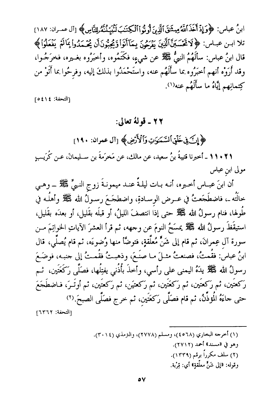 11021 - أَخْبَرَنَا قُتَيْبَةُ بْنُ سَعِيدٍ، عَنْ مَالِكٍ، عَنْ مَخْرَمَةَ بْنِ سُلَيْمَانَ، عَنْ كُرَيْبٍ مَوْلَى ابْنِ عَبَّاسٍ: أَنَّ ابْنَ عَبَّاسٍ أَخْبَرَهُ أَنَّهُ بَاتَ لَيْلَةً عِنْدَ مَيْمُونَةٍ زَوْجِ النَّبِيِّ صَلَّى اللهُ عَلَيْهِ وَسَلَّمَ وَهِيَ خَالَتُهُ، فَاضْطَجَعْتُ فِي عَرْضِ الْوِسَادَةِ، وَاضْطَجَعَ رَسُولُ اللهِ صَلَّى اللهُ عَلَيْهِ وَسَلَّمَ وَأَهْلُهُ فِي طُولِهَا، فَنَامَ رَسُولُ اللهِ صَلَّى اللهُ عَلَيْهِ وَسَلَّمَ حَتَّى إِذَا انْتَصَفَ اللَّيْلُ أَوْ قَبْلَهُ بِقَلِيلٍ أَوْ بَعْدَهُ بِقَلِيلٍ اسْتَيْقَظَ رَسُولُ اللهِ صَلَّى اللهُ عَلَيْهِ وَسَلَّمَ يَمْسَحُ النَّوْمَ عَنْ وَجْهِهِ، ثُمَّ §قَرَأَ الْعَشْرَ الْآيَاتِ الْخَوَاتِمَ مِنْ سُورَةِ آلِ عِمْرَانَ، ثُمَّ قَامَ إِلَى شَنٍّ مُعَلَّقَةٍ، فَتَوَضَّأَ مِنْهَا وُضُوءَهُ، ثُمَّ قَامَ يُصَلِّي، قَالَ ابْنُ عَبَّاسٍ: فَقُمْتُ فَصَنَعْتُ مِثْلَ مَا صَنَعَ، وَذَهَبْتُ فَقُمْتُ إِلَى جَنْبِهِ، فَوَضَعَ رَسُولُ اللهِ صَلَّى اللهُ عَلَيْهِ وَسَلَّمَ يَدُهُ الْيُمْنَى عَلَى رَأْسِي، وَأَخَذَ بِأُذُنِي يَفْتِلُهَا، فَصَلَّى رَكْعَتَيْنِ، ثُمَّ رَكْعَتَيْنِ، ثُمَّ رَكْعَتَيْنِ، ثُمَّ رَكْعَتَيْنِ، ثُمَّ رَكْعَتَيْنِ، ثُمَّ رَكْعَتَيْنِ، ثُمَّ أَوْتَرَ فَاضْطَجَعَ حَتَّى جَاءَهُ الْمُؤَذِّنُ، ثُمَّ قَامَ فَصَلَّى رَكْعَتَيْنِ، ثُمَّ خَرَجَ فَصَلَّى الصُّبْحَ