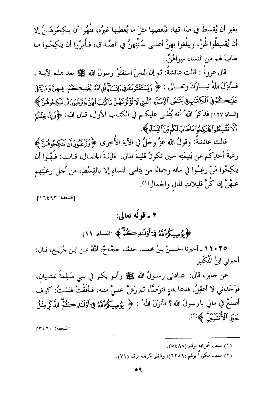 11025 - أَخْبَرَنَا الْحَسَنُ بْنُ مُحَمَّدٍ، حَدَّثَنَا حَجَّاجٌ، أَدَّاهُ، عَنِ ابْنِ جُرَيْجٍ، قَالَ: أَخْبَرَنِي ابْنُ الْمُنْكَدِرِ، عَنْ جَابِرٍ، قَالَ: عَادَنِي رَسُولُ اللهِ صَلَّى اللهُ عَلَيْهِ وَسَلَّمَ وَأَبُو بَكْرٍ فِي بَنِي سَلَمَةَ يَمْشِيَانَ، فَوَجَدَانِي لَا أَعْقِلُ، فَدَعَا بِمَاءٍ فَتَوَضَّأَ، ثُمَّ رَشَّ عَلَيَّ مِنْهُ، فَأَفَقْتُ فَقُلْتُ: كَيْفَ أَصْنَعُ فِي مَالِي يَا رَسُولَ اللهِ؟ فَأَنْزَلَ اللهُ {§يُوصِيكُمُ اللهُ فِي أَوْلَادِكُمْ لِلذَّكَرِ مِثْلُ حَظِّ الْأُنْثَيَيْنِ} [النساء: 11]