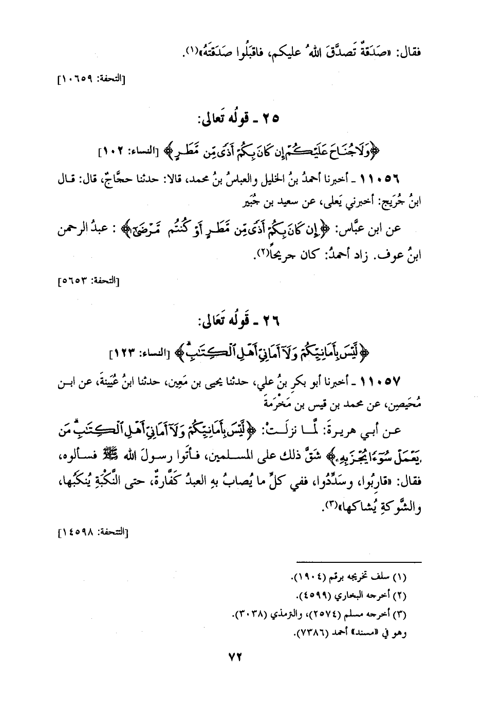 11056 - أَخْبَرَنَا أَحْمَدُ بْنُ الْخَلِيلِ، وَالْعَبَّاسُ بْنُ مُحَمَّدٍ، قَالَا: حَدَّثَنَا حَجَّاجٌ، قَالَ: قَالَ ابْنُ جُرَيْجٍ: أَخْبَرَنِي يَعْلَى، عَنْ سَعِيدِ بْنِ جُبَيْرٍ، عَنِ ابْنِ عَبَّاسٍ: {§إِنْ كَانَ بِكُمْ أَذًى مِنْ مَطَرٍ أَوْ كُنْتُمْ مَرْضَى} [النساء: 102] عَبْدُ الرَّحْمَنِ بْنُ عَوْفٍ - زَادَ أَحْمَدُ - كَانَ جَرِيحًا