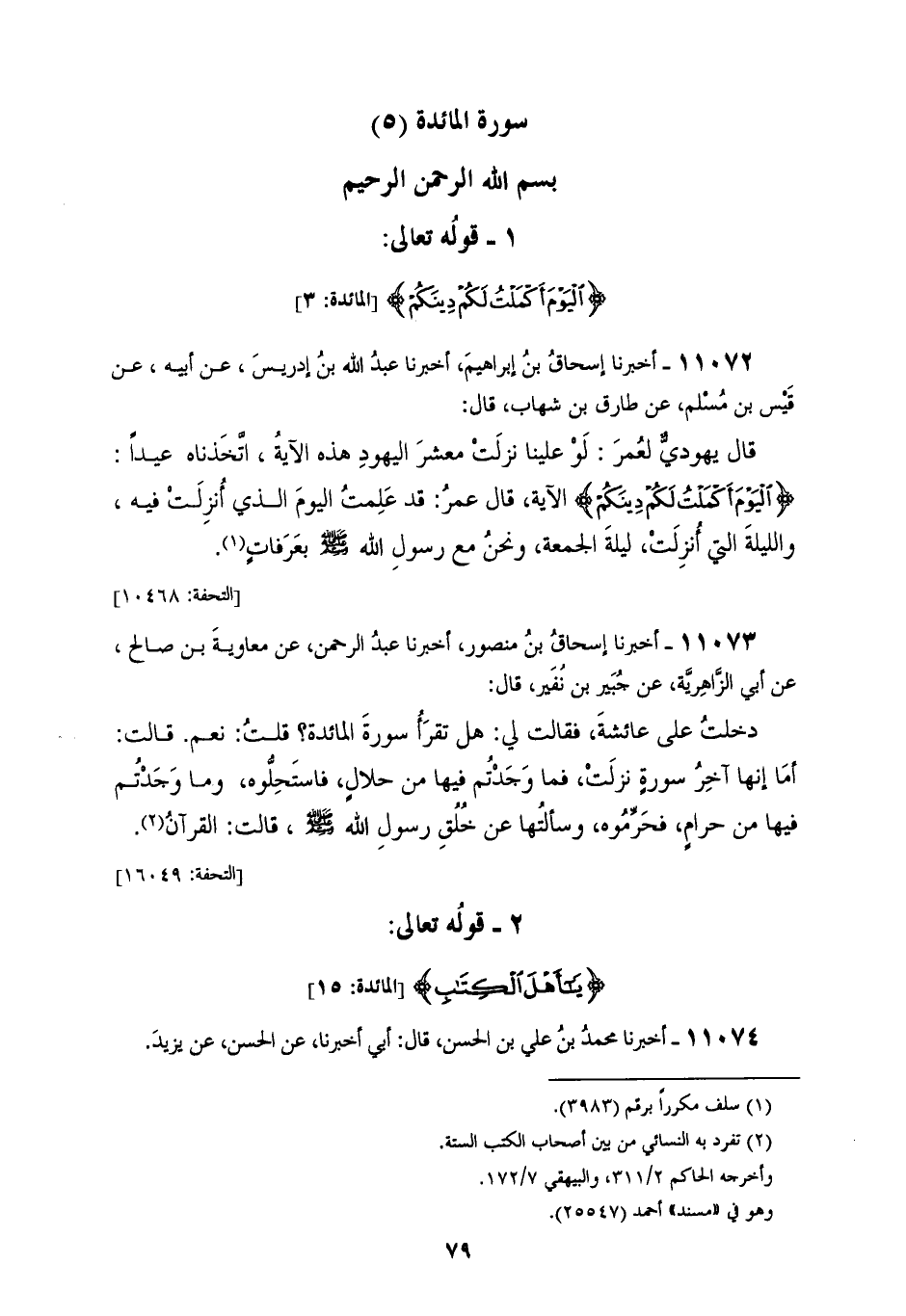 11073 - أَخْبَرَنَا إِسْحَاقُ بْنُ مَنْصُورٍ، أَخْبَرَنَا عَبْدُ الرَّحْمَنِ، عَنْ مُعَاوِيَةَ بْنِ صَالِحٍ، عَنْ أَبِي الزَّاهِرِيَّةِ، عَنْ جُبَيْرِ بْنِ نُفَيْرٍ، قَالَ: دَخَلْتُ عَلَى عَائِشَةَ فَقَالَتْ لِي: هَلْ تَقْرَأُ سُورَةَ الْمَائِدَةِ؟ قُلْتُ: نَعَمْ، قَالَتْ: «أَمَا إِنَّهَا» §آخِرُ سُورَةٍ نَزَلَتْ، فَمَا وَجَدْتُمْ فِيهَا مِنْ حَلَالٍ فَاسْتَحِلُّوهُ، وَمَا وَجَدْتُمْ فِيهَا مِنْ حَرَامٍ فَحَرِّمُوهُ، وَسَأَلْتُهَا عَنْ خُلِقِ رَسُولِ اللهِ صَلَّى اللهُ عَلَيْهِ وَسَلَّمَ قَالَتِ: الْقُرْآنُ