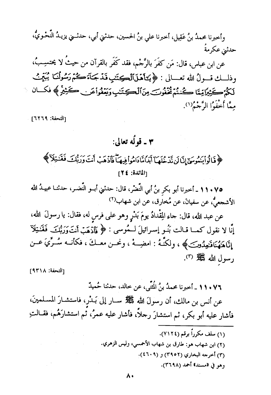11075 - أَخْبَرَنَا أَبُو بَكْرِ بْنِ أَبِي النَّضْرِ، قَالَ: حَدَّثَنِي أَبُو النَّضْرِ، حَدَّثَنَا عُبَيْدُ اللهِ الْأَشْجَعِيُّ، عَنْ سُفْيَانَ، عَنْ مُخَارِقٍ، عَنِ ابْنِ شِهَابٍ، عَنْ عَبْدِ اللهِ، قَالَ: جَاءَ الْمِقْدَادُ يَوْمَ بَدْرٍ وَهُوَ عَلَى فَرَسٍ لَهُ فَقَالَ: يَا رَسُولَ اللهِ، إِنَّا لَا نَقُولُ كَمَا قَالَتْ بَنُو إِسْرَائِيلَ لِمُوسَى: {§فَاذْهَبْ أَنْتَ وَرَبُّكَ فَقَاتِلَا إِنَّا هَاهُنَا قَاعِدُونَ} [المائدة: 24] وَلَكِنَّهُ: امْضِهْ وَنَحْنُ مَعَكَ، فَكَأَنَّهُ سُرِّيَ عَنْ رَسُولِ اللهِ صَلَّى اللهُ عَلَيْهِ وَسَلَّمَ