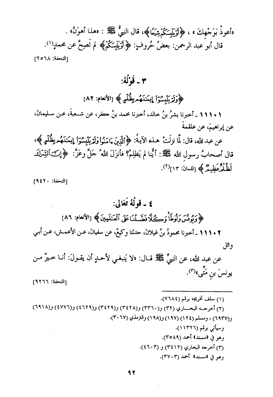 11101 - أَخْبَرَنَا بِشْرُ بْنُ خَالِدٍ، أَخْبَرَنَا مُحَمَّدُ بْنُ جَعْفَرٍ، عَنْ شُعْبَةَ، عَنْ سُلَيْمَانَ، عَنْ إِبْرَاهِيمَ، عَنْ عَلْقَمَةَ، عَنْ عَبْدِ اللهِ، قَالَ: " §لَمَّا نَزَلَتْ هَذِهِ الْآيَةُ: {الَّذِينَ آمَنُوا وَلَمْ يَلْبِسُوا} [الأنعام: 82] إِيمَانَهُمْ بِظُلْمٍ قَالَ أَصْحَابُ رَسُولِ اللهِ صَلَّى اللهُ عَلَيْهِ وَسَلَّمَ: أَيُّنَا لَمْ يَظْلِمْ؟ فَأَنْزَلَ اللهُ جَلَّ وَعَزَّ: {إِنَّ الشِّرْكَ} [لقمان: 13] لَظُلْمٌ عَظِيمٌ