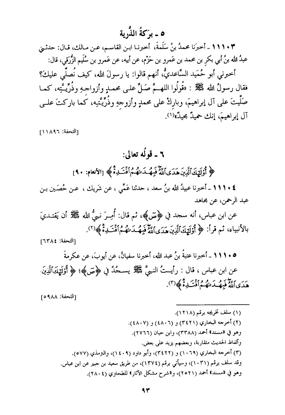 11105 - أَخْبَرَنَا عُتْبَةُ بْنُ عَبْدِ اللهِ، أَخْبَرَنَا سُفْيَانُ، عَنْ أَيُّوبَ، عَنْ عِكْرِمَةَ، عَنِ ابْنِ عَبَّاسٍ، قَالَ: رَأَيْتُ النَّبِيَّ صَلَّى اللهُ عَلَيْهِ وَسَلَّمَ §يَسْجُدُ فِي ص {أُولَئِكَ الَّذِينَ هَدَى اللهُ فَبِهُدَاهُمُ اقْتَدِهْ} [الأنعام: 90]
