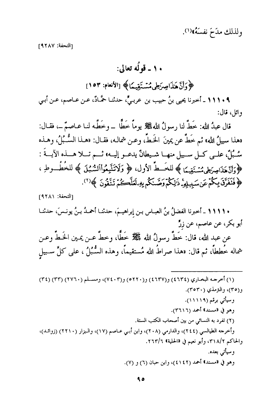 11109 - أَخْبَرَنَا يَحْيَى بْنُ حَبِيبِ بْنِ عَرَبِيٍّ، حَدَّثَنَا حَمَّادٌ، عَنْ عَاصِمٍ، عَنْ أَبِي وَائِلٍ، قَالَ: قَالَ عَبْدُ اللهِ: خَطَّ لَنَا رَسُولُ اللهِ صَلَّى اللهُ عَلَيْهِ وَسَلَّمَ يَوْمًا خَطًّا، وَخَطَّهُ لَنَا عَاصِمٌ فَقَالَ: «§هَذَا سَبِيلُ اللهِ» ثُمَّ خَطَّ عَنْ يَمِينِ الْخَطِّ وَعَنْ شِمَالِهِ فَقَالَ: «هَذَا السَّبِيلُ، وَهَذِهِ سُبُلٌ عَلَى كُلِّ سَبِيلٍ مِنْهَا شَيْطَانٌ يَدْعُو إِلَيْهِ» ثُمَّ تَلَا هَذِهِ الْآيَةَ {وَأَنَّ هَذَا صِرَاطِي مُسْتَقِيمًا} [الأنعام: 153] لِلْخَطِّ الْأَوَّلِ، {وَلَا تَتَّبِعُوا السُّبُلَ} [الأنعام: 153] لِلْخُطُوطِ {فَتَفَرَّقَ بِكُمْ عَنْ سَبِيلِهِ} [الأنعام: 153] ذَلِكُمْ {وَصَّاكُمْ بِهِ لَعَلَّكُمْ تَتَّقُونَ} [الأنعام: 153]