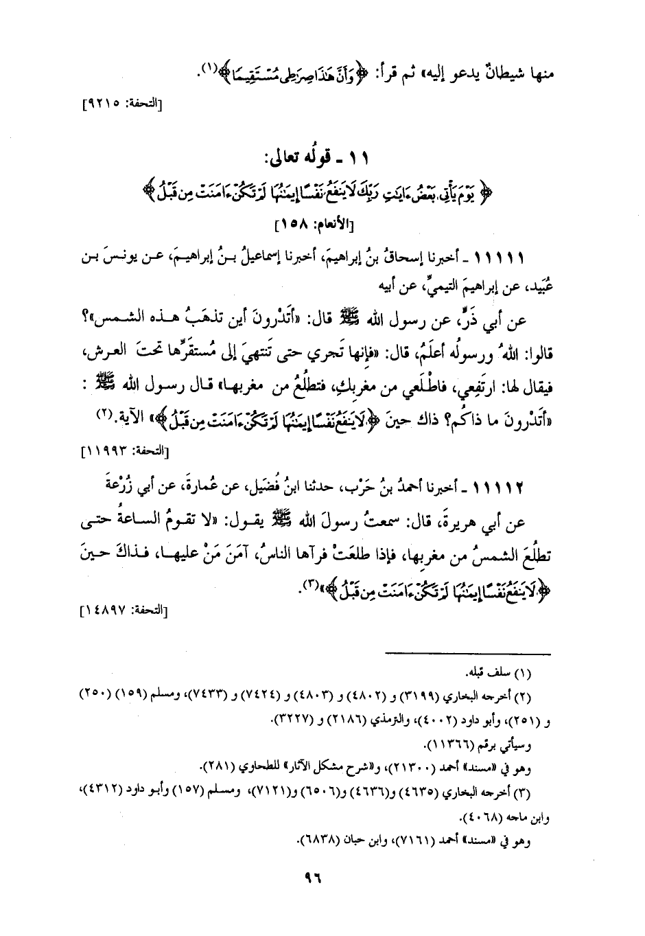 11111 - أَخْبَرَنَا إِسْحَاقُ بْنُ إِبْرَاهِيمَ، أَخْبَرَنَا إِسْمَاعِيلُ بْنُ إِبْرَاهِيمَ، عَنْ يُونُسَ بْنِ عُبَيْدٍ، عَنْ إِبْرَاهِيمَ التَّيْمِيِّ، عَنْ أَبِيهِ، عَنْ أَبِي ذَرٍّ عَنْ رَسُولِ اللهِ صَلَّى اللهُ عَلَيْهِ وَسَلَّمَ قَالَ: «§أَتَدْرُونَ أَيْنَ تَذْهَبُ هَذِهِ الشَّمْسُ؟» قَالُوا: اللهُ وَرَسُولُهُ أَعْلَمُ، قَالَ: " فَإِنَّهَا تَجْرِي حَتَّى تَنْتَهِيَ إِلَى مُسْتَقَرِّهَا تَحْتَ الْعَرْشِ، فَيُقَالُ لَهَا: ارْتَفِعِي فَاطْلُعِي مِنْ مَغْرِبِكَ فَتَطْلُعُ مِنْ مَغْرِبِهَا " قَالَ رَسُولُ اللهِ صَلَّى اللهُ عَلَيْهِ وَسَلَّمَ: " أَتَدْرُونَ مَا ذَاكُمْ؟ ذَاكَ حِينَ {لَا يَنْفَعُ نَفْسًا إِيمَانُهَا لَمْ تَكُنْ آمَنَتْ مِنْ قَبْلُ} [الأنعام: 158] الْآيَةَ
