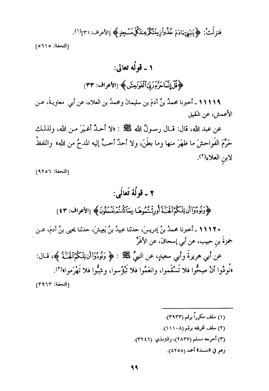 11119 - أَخْبَرَنَا مُحَمَّدُ بْنُ آدَمَ بْنِ سُلَيْمَانَ، وَمُحَمَّدُ بْنُ الْعَلَاءِ، عَنْ أَبِي مُعَاوِيَةَ، عَنِ الْأَعْمَشِ، عَنْ شَقِيقٍ، عَنْ عَبْدِ اللهِ، قَالَ: قَالَ رَسُولُ اللهِ صَلَّى اللهُ عَلَيْهِ وَسَلَّمَ: «§لَا أَحَدَ أَغْيَرُ مِنَ اللهِ، وَلِذَلِكَ حَرَّمَ الْفَوَاحِشَ مَا ظَهَرَ مِنْهَا وَمَا بَطَنَ، وَلَا أَحَدَ أَحَبُّ إِلَيْهِ الْمَدْحُ مِنَ اللهِ» وَاللَّفْظُ لِابْنِ الْعَلَاءِ