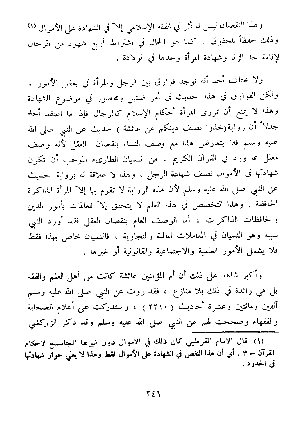 (¬1) قال الإمام القرطبي: «وَإِنَّمَا كَانَ ذَلِكَ فِي الأَمْوَالِ دُونَ غَيْرِهَا» " الجامع لأحكام القرآن ": جـ 3. أي أن هذا النقص في الشهادة على الأموال فقط وهذا لا يعني جواز شهادتها في الحدود.