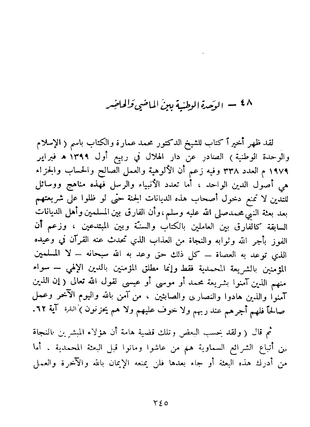 لقد ظهر أخيرًا كتاب للشيخ الدكتور محمد عمارة، والكتاب باسم " الإسلام والوحدة الوطنية " الصادر عن دار الهلال في ربيع أول 1399 هـ - فبراير 1979 م، العدد 338. وفيه زعم أن الألوهية والعمل الصالح والحساب والجزاء هي أصول الدين الواحد، أما تعدد الأنبياء والرسل فهذه مناهج ووسائل للتدين لا تمنع دخول أصحاب هذه الديانات الجنة حتى لو ظلوا على شريعتهم بعد بعثة النبي محمد - صَلََّى اللهُ عَلَيْهِ وَسَلَّمَ -، وأن الفارق بين المسلمين وأهل الديانات السابقة كالفارق بين العاملين بالكتاب والسنة وبين المبتدعين، وزعم أن الفوز بأجر الله وثوابه والنجاة من العذاب الذي تحدث عنه القرآن في وعيده الذي توعد به العصاة - كل ذلك حق وعد به الله سبحانه - لا المسلمين المؤمنين بالشريعة المحمدية فقط وإنما مطلق المؤمنين بالدين الإلهي سواء منهم الذين آمنوا بشريعة محمد أو موسى أو عيسى لقول الله: {إِنَّ الَّذِينَ آمَنُوا وَالَّذِينَ هَادُوا وَالنَّصَارَى وَالصَّابِئِينَ مَنْ آمَنَ بِاللَّهِ وَالْيَوْمِ الآخِرِ وَعَمِلَ صَالِحًا فَلَهُمْ أَجْرُهُمْ عِنْدَ رَبِّهِمْ وَلاَ خَوْفٌ عَلَيْهِمْ وَلاَ هُمْ يَحْزَنُونَ} [البقرة: 62].