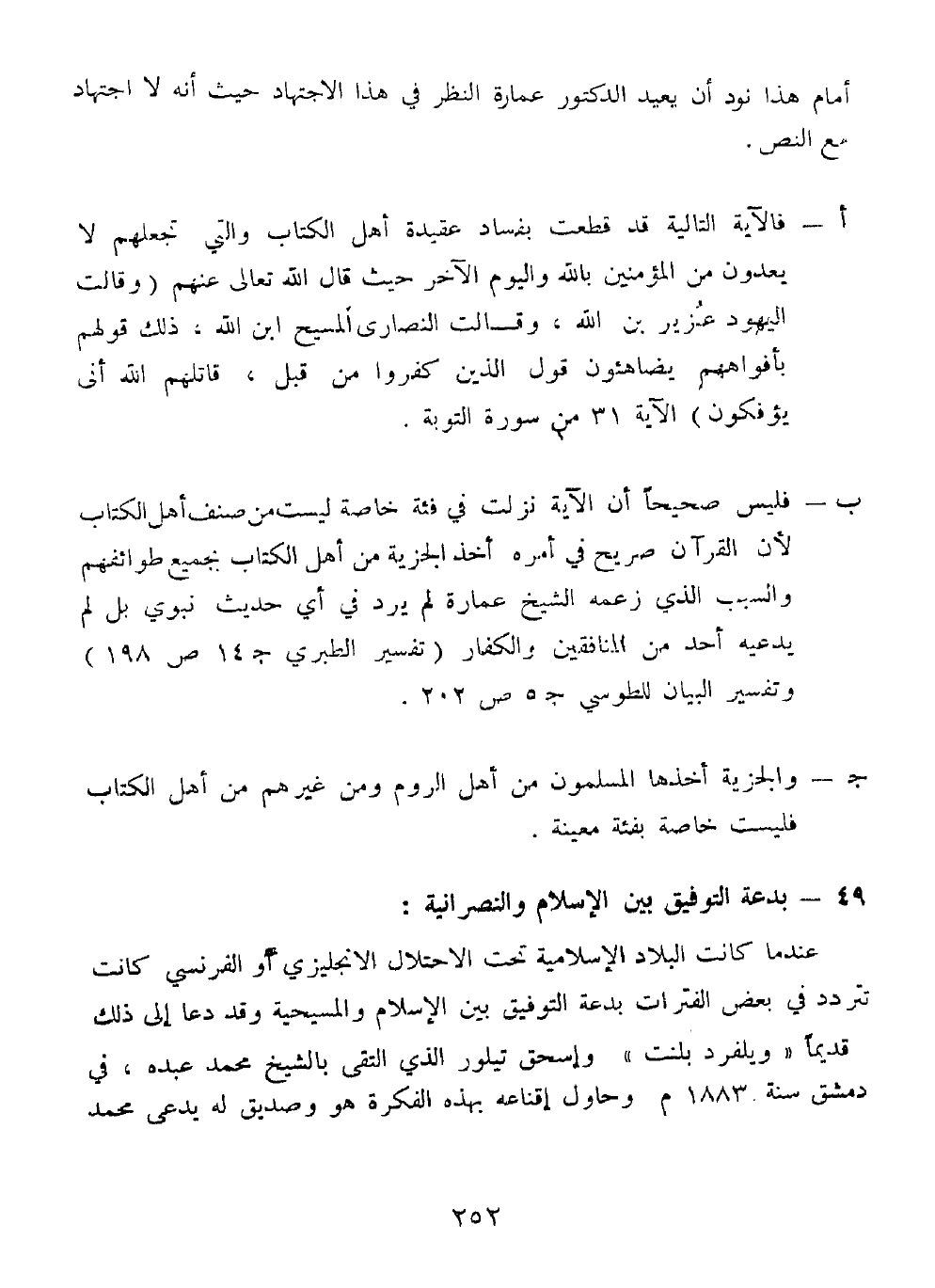 ب - فليس صحيحًا أن الآية نزلت في فئة خاصة ليست من صنف أهل الكتاب لأن القرآن صريح في أمره أخذ الجزية من أهل الكتاب بجميع طوائفهم والسبب الذي زعمه الشيخ عمارة لم يرد في أي حديث نبوي بل لم يدعيه أحد من المنافقين والكفار [" تفسير الطبري ": جـ 14 ص 198 و " تفسير البيان " للطوسي: جـ 5 ص 202].