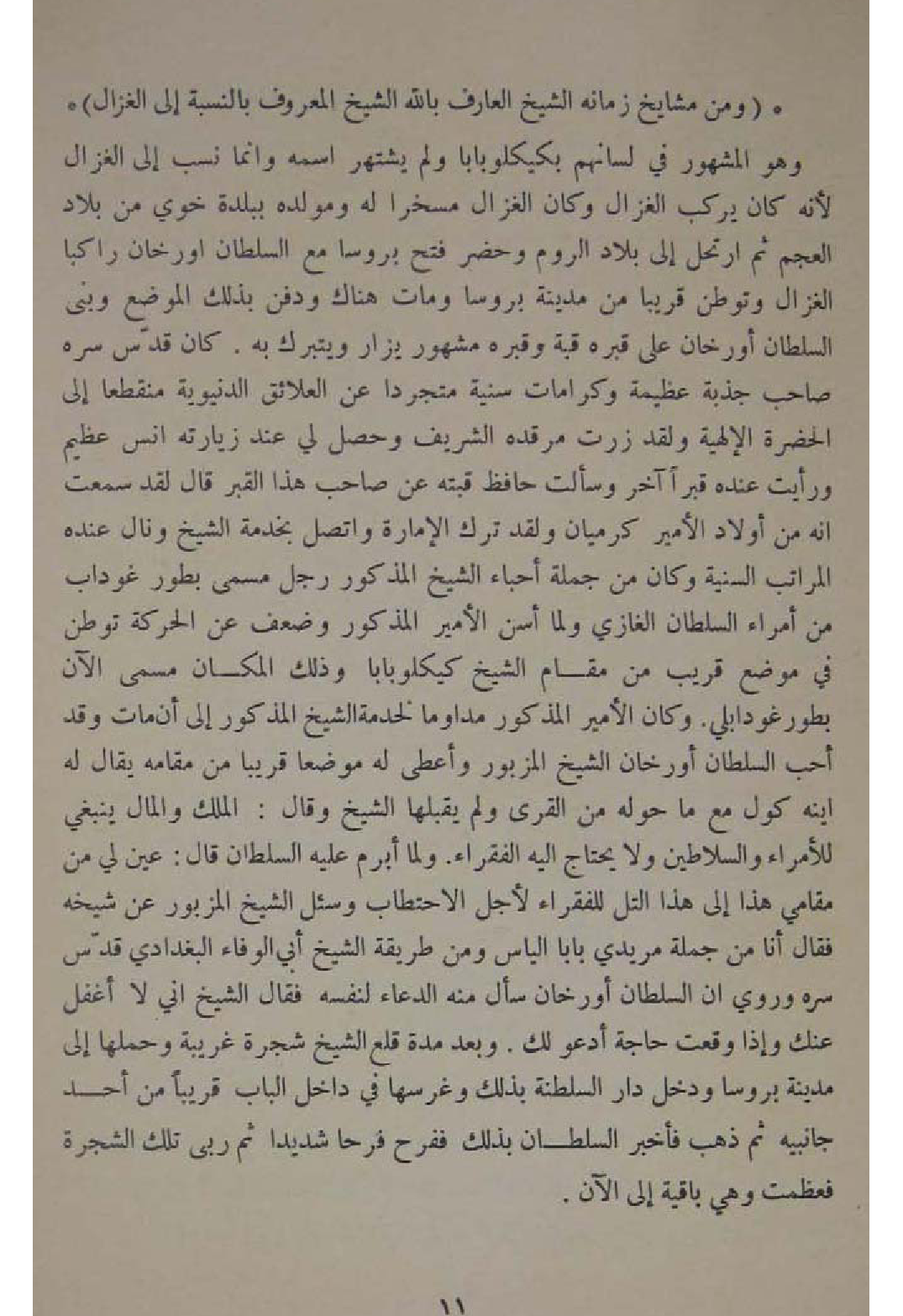 وَهُوَ الْمَشْهُور فِي لسانهم بكيكلوبابا وَلم يشْتَهر اسْمه وانما نسب الى الغزال لانه كَانَ يركب الغزال وَكَانَ الغزال مسخرا لَهُ ومولده ببلدة خوي من بلادالعجم ثمَّ ارتحل الى بلادالروم وَحضر فتح بروسا مَعَ السُّلْطَان اورخان رَاكِبًا الغزال وتوطن قَرِيبا من مَدِينَة بروسا وَمَات هُنَاكَ وَدفن بذلك الْموضع وَبنى السُّلْطَان اورخان على قَبره قبَّة وقبره مَشْهُور يزار ويتبرك بِهِ كَانَ قدس سره صَاحب جذبة عَظِيمَة وكرامات سنية متجردا عَن العلائق الدُّنْيَوِيَّة مُنْقَطِعًا الى الحضرة الالهية وَلَقَد زرت مرقده الشريف وَحصل لي عِنْد زيارته انس عَظِيم وَرَأَيْت عِنْده قبر آخر وَسَأَلت حَافظ قُبَّته عَن صَاحب هَذَا الْقَبْر قَالَ لقد سَمِعت انه من اولاد الامير كرميان وَلَقَد ترك الامارة واتصل بِخِدْمَة الشَّيْخ ونال عِنْده الْمَرَاتِب السّنيَّة وَكَانَ من جملَة احباء الشَّيْخ الْمَذْكُور رجل مُسَمّى بطور غوداب من أُمَرَاء السُّلْطَان الْغَازِي وَلما اسن الامير الْمَذْكُور وَضعف عَن الْحَرَكَة توطن فِي مَوضِع قريب من مقَام الشَّيْخ كيكلو بَابا وَذَلِكَ الْمَكَان مُسَمّى الان بطورغودابلي وَكَانَ الامير الْمَذْكُور مداوما لخدمة الشَّيْخ الْمَذْكُور الى ان مَاتَ وَقد أحب السُّلْطَان اورخان الشَّيْخ الْمَزْبُور واعطى لَهُ موضعا قَرِيبا من مقَامه يُقَال لَهُ اينه كول مَعَ مَا حوله من الْقرى وَلم يقبلهَا الشَّيْخ وَقَالَ الْملك وَالْمَال يَنْبَغِي لِلْأُمَرَاءِ والسلاطين وَلَا يحْتَاج اليه الْفُقَرَاء وَلما أبرم عَلَيْهِ السُّلْطَان قَالَ عين لي من مقَامي هَذَا الى هَذَا التل للْفُقَرَاء لاجل الاحتطاب وَسُئِلَ الشَّيْخ الْمَزْبُور عَن شَيْخه فَقَالَ انا من جملَة مريدي بَابا الياس وَمن طَريقَة الشَّيْخ ابي الْوَفَاء الْبَغْدَادِيّ قدس سره وَرُوِيَ ان السُّلْطَان اورخان سَأَلَ مِنْهُ الدُّعَاء لنَفسِهِ فَقَالَ الشَّيْخ اني لَا أغفل عَنْك وَإِذا وَقعت حَاجَة ادعو لَك وَبعد مُدَّة قلع الشَّيْخ شَجَرَة غَرِيبَة وَحملهَا الى مَدِينَة بروسا وَدخل دَار السلطنة بذلك وغرسها فِي دَاخل الْبَاب قَرِيبا من اُحْدُ جانبيه ثمَّ ذهب فَأخْبر السُّلْطَان بذلك ففرح فَرحا شَدِيدا ثمَّ ربى تِلْكَ الشَّجَرَة فعظمت وَهِي بَاقِيَة الى الان