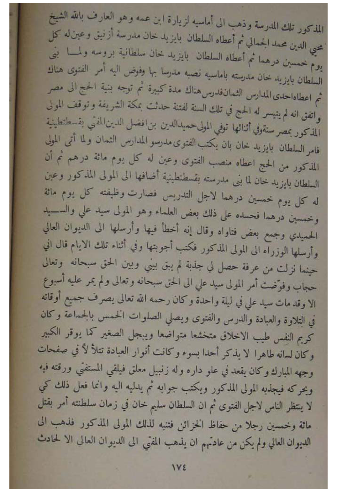 الْمَذْكُور تِلْكَ الْمدرسَة وَذهب الى أماسيه لزيارة ابْن عَمه وَهُوَ الْعَارِف بِاللَّه الشَّيْخ محيي الدّين مُحَمَّد الجمالي ثمَّ اعطاه السُّلْطَان بايزيد خَان مدرسة ازنيق وَعين لَهُ كل يَوْم خمسين درهما ثمَّ اعطاه السُّلْطَان بايزيد خَان سلطانية بروسه وَلما بنى السُّلْطَان بايزيدخان مدرسته باماسيه نَصبه مدرسا بهَا وفوض اليه أَمر الْفَتْوَى هُنَاكَ ثمَّ اعطاه احدى الْمدَارِس الثمان فدرس هُنَاكَ مُدَّة كَبِيرَة ثمَّ توجه بنية الْحَج الى مصر وَاتفقَ انه لم يَتَيَسَّر لَهُ الْحَج فِي تِلْكَ السّنة لفتنة حدثت بِمَكَّة الشَّرِيفَة وَتوقف الْمولى الْمَذْكُور بِمصْر سنة وَفِي أَثْنَائِهَا توفّي الْمولى حميد الدّين بن افضل الدّين الْمُفْتِي بقسطنطينية فَأمر السُّلْطَان بايزيدخان بَان يكْتب الْفَتْوَى مدرسوالمدارس الثمان وَلما أَتَى الْمولى الْمَذْكُور من الْحَج اعطاه منصب الْفَتْوَى وَعين لَهُ كل يَوْم مائَة دِرْهَم ثمَّ ان السُّلْطَان بايزيدخان لما بنى مدرسته بقسطنطينية اضافها الى الْمولى الْمَذْكُور وَعين لَهُ كل يَوْم خمسين درهما لاجل التدريس فَصَارَت وظيفته كل يَوْم مائَة وَخمسين درهما فحسده على ذَلِك بعض الْعلمَاء وَهُوَ الْمولى سيد عَليّ وَالسَّيِّد الْحميدِي وَجمع بعض فَتَاوَاهُ وَقَالَ إِنَّه اخطأ فِيهَا وارسلها الى الدِّيوَان العالي وارسلها الوزراء الى الْمولى الْمَذْكُور فَكتب اجوبتها وَفِي اثناء تِلْكَ الايام قَالَ اني حينما نزلت من عَرَفَة حصل لي جذبة لم يبْق بيني وَبَين الْحق سُبْحَانَهُ وَتَعَالَى حجاب وفوضت امْر الْمولى سيد عَليّ الى الْحق سُبْحَانَهُ وَتَعَالَى وَلم يمر عَلَيْهِ اسبوع الا وَقد مَاتَ سيد عَليّ فِي لَيْلَة وَاحِدَة وَكَانَ رَحمَه الله تَعَالَى يصرف جَمِيع أوقاته فِي التِّلَاوَة وَالْعِبَادَة والدرس وَالْفَتْوَى وَيُصلي الصَّلَوَات الْخمس بِالْجَمَاعَة وَكَانَ كريم النَّفس طيب الاخلاق متخشعا متواضعا ويبجل الصَّغِير كَمَا يوقر الْكَبِير وَكَانَ لِسَانه طَاهِرا لَا يذكر احدا بِسوء وَكَانَ انوار الْعِبَادَة تتلألأ فِي صفحات وَجهه الْمُبَارك وَكَانَ يقْعد فِي علو دَاره وَله زنبيل مُعَلّق فيلقي المستفتي ورقته فِيهِ ويحركه فيجذبه الْمولى الْمَذْكُور وَيكْتب جَوَابه ثمَّ يدليه اليه وَإِنَّمَا فعل ذَلِك كي لَا ينْتَظر النَّاس لاجل الْفَتْوَى ثمَّ ان السُّلْطَان سليم خَان فِي زمَان سلطنته امْر بقتل مائَة وَخمسين رجلا من حفاظ الخزائن فَتنبه لذَلِك الْمولى الْمَذْكُور فَذهب الى الدِّيوَان العالي وَلم يكن من عَادَتهم ان يذهب الْمُفْتِي الى الدِّيوَان العالي الا لحاديث