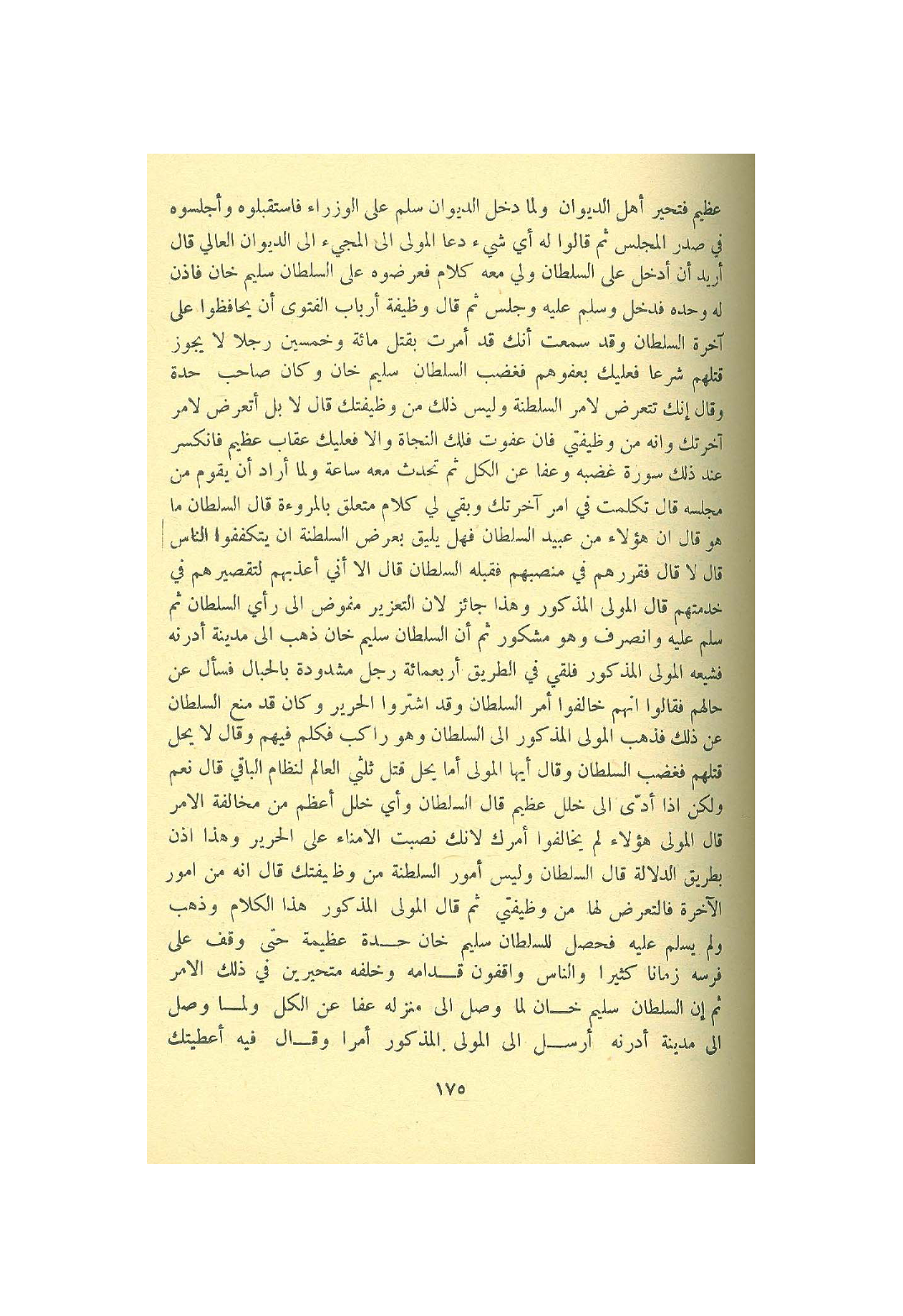 عَظِيم فتحير اهل الدِّيوَان وَلما دخل الدِّيوَان سلم على الوزراء فاستقبلوه واجلسوه فِي صدر الْمجْلس ثمَّ قَالُوا لَهُ أَي شَيْء دَعَا الْمولى الى الْمَجِيء الى الدِّيوَان العالي قَالَ اريد ان ادخل على السُّلْطَان ولي مَعَه كَلَام فَعَرَضُوهُ على السُّلْطَان سليم خَان فاذن لَهُ وَحده فَدخل وَسلم عَلَيْهِ وَجلسَ ثمَّ قَالَ وَظِيفَة أَرْبَاب الْفَتْوَى ان يحافظوا على آخِرَة السُّلْطَان وَقد سَمِعت انك قد امرت بقتل مائَة وَخمسين رجلا لَا يجوز قَتلهمْ شرعا فَعَلَيْك بعفوهم فَغَضب السُّلْطَان سليم خَان وَكَانَ صَاحب حِدة وَقَالَ إِنَّك تتعرض لامر السلطنة وَلَيْسَ ذَلِك من وظيفتك قَالَ لَا بل اتعرض لامر آخرتك وانه من وظيفتي فان عَفَوْت فلك النجَاة والا فَعَلَيْك عِقَاب عَظِيم فانكسر كند ذَلِك سُورَة غَضَبه وَعَفا عَن الْكل ثمَّ تحدث مَعَه سَاعَة وَلما اراد ان يقوم من مَجْلِسه قَالَ تَكَلَّمت فِي أَمر آخرتك وَبَقِي لي كَلَام مُتَعَلق بالمروءة قَالَ السُّلْطَان مَا هُوَ قَالَ ان هَؤُلَاءِ من عبيد السلطان فَهَل يَلِيق بِعرْض السلطنة ان يتكففوا النَّاس قَالَ لَا قَالَ فقررهم فِي منصبهم فَقبله السُّلْطَان قَالَ الا اني اعذبهم لتقصيرهم فِي خدمتهم قَالَ الْمولى الْمَذْكُور وَهَذَا جَائِز لَان التَّعْزِير مفوض الى راي السُّلْطَان ثمَّ سلم عَلَيْهِ وَانْصَرف وَهُوَ مشكور ثمَّ ان السُّلْطَان سليم خَان ذهب الى مَدِينَة ادرنه فشيعه الْمولى الْمَذْكُور فلقي فِي الطَّرِيق اربعمائة رجل مشدودة بالحبال فَسَأَلَ عَن حَالهم فَقَالُوا انهم خالفوا أَمر السُّلْطَان وَقد اشْتَروا الْحَرِير وَكَانَ قد منع السُّلْطَان عَن ذَلِك فَذهب الْمولى الْمَذْكُور الى السُّلْطَان وَهُوَ رَاكب فَكلم فيهم وَقَالَ لَا يحل قَتلهمْ فَغَضب السُّلْطَان وَقَالَ ايها الْمولى اما يحل قتل ثُلثي الْعَالم لنظام الْبَاقِي قَالَ نعم وَلَكِن اذا ادى الى خلل عَظِيم قَالَ السُّلْطَان وَأي خلل اعظم من مُخَالفَة الامر قَالَ الْمولى هَؤُلَاءِ لم يخالفوا امرك لانك نصبت الامناء على الْحَرِير وَهَذَا اذن بطرِيق الدّلَالَة قَالَ السُّلْطَان وَلَيْسَ امور السلطنة من وظيفتك قَالَ انه من امور الاخرة فالتعرض لَهَا من وظيفتي ثمَّ قَالَ الْمولى الْمَذْكُور هَذَا الْكَلَام وَذهب وَلم يسلم عَلَيْهِ فَحصل للسُّلْطَان سليم خَان حِدة عَظِيمَة حَتَّى وقف على فرسه زَمَانا كثيرا وَالنَّاس واقفون قدامه وَخَلفه متحيرين فِي ذَلِك الامر ثمَّ ان السُّلْطَان سليم خَان لما وصل الى منزله عَفا عَن الْكل وَلما وصل الى مَدِينَة ادرنه ارسل الى الْمولى الْمَذْكُور امرا وَقَالَ فِيهِ اعطيتك