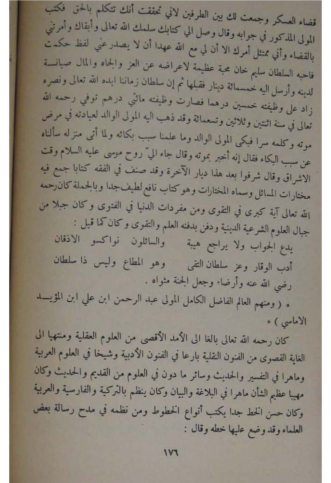 قَضَاء الْعَسْكَر وجمعت لَك بَين الطَّرفَيْنِ لاني تحققت انك تَتَكَلَّم بِالْحَقِّ فَكتب الْمولى الْمَذْكُور فِي جَوَابه وَقَالَ وصل الي كتابك سلمك الله تَعَالَى وأبقاك وأمرتني بِالْقضَاءِ وَأَنِّي ممتثل امرك الا ان لي مَعَ الله عهدا ان لَا يصدر عني لفظ حكمت فاحبه السُّلْطَان سليم خَان محبَّة عَظِيمَة لاعراضه عَن الْعِزّ والجاه وَالْمَال صِيَانة لدينِهِ وارسل اليه خَمْسمِائَة دِينَار فقبلها ثمَّ ان سُلْطَان زَمَاننَا ايده الله تَعَالَى وَنَصره زَاد على وظيفته خمسين درهما فَصَارَت وظيفته مِائَتي دِرْهَم توفّي رَحمَه الله تَعَالَى فِي سنة اثْنَتَيْنِ وَثَلَاثِينَ وَتِسْعمِائَة وَقد ذهب اليه الْمولى الْوَالِد لعيادته فِي مرض مَوته وَكَلمه سرا فَبكى الْمولى الْوَالِد وَمَا علمنَا سَبَب بكائه وَلما اتى منزله سألناه عَن سَبَب الْبكاء فَقَالَ إِنَّه أخبر بِمَوْتِهِ وَقَالَ جَاءَ الي روح مُوسَى عَلَيْهِ السَّلَام وَقت الاشراق وَقَالَ شرفوا بعدهذا ديار الاخرة وَقد صنف فِي الْفِقْه كتابا جمع فِيهِ مختارات الْمسَائِل وَسَماهُ المختارات وَهُوَ كتاب نَافِع لطيف جدا وَبِالْجُمْلَةِ كَانَ رَحمَه الله تَعَالَى آيَة كبرى فِي التَّقْوَى وَمن مُفْرَدَات الدُّنْيَا فِي الْفَتْوَى وَكَانَ جبلا من جبال الْعُلُوم الشَّرْعِيَّة الدِّينِيَّة وَدفن بدفنه الْعلم وَالتَّقوى وَكَانَ كَمَا قيل ... يدع الْجَواب وَلَا يُرَاجع هَيْبَة ... والسائلون نواكسو الاذقان
