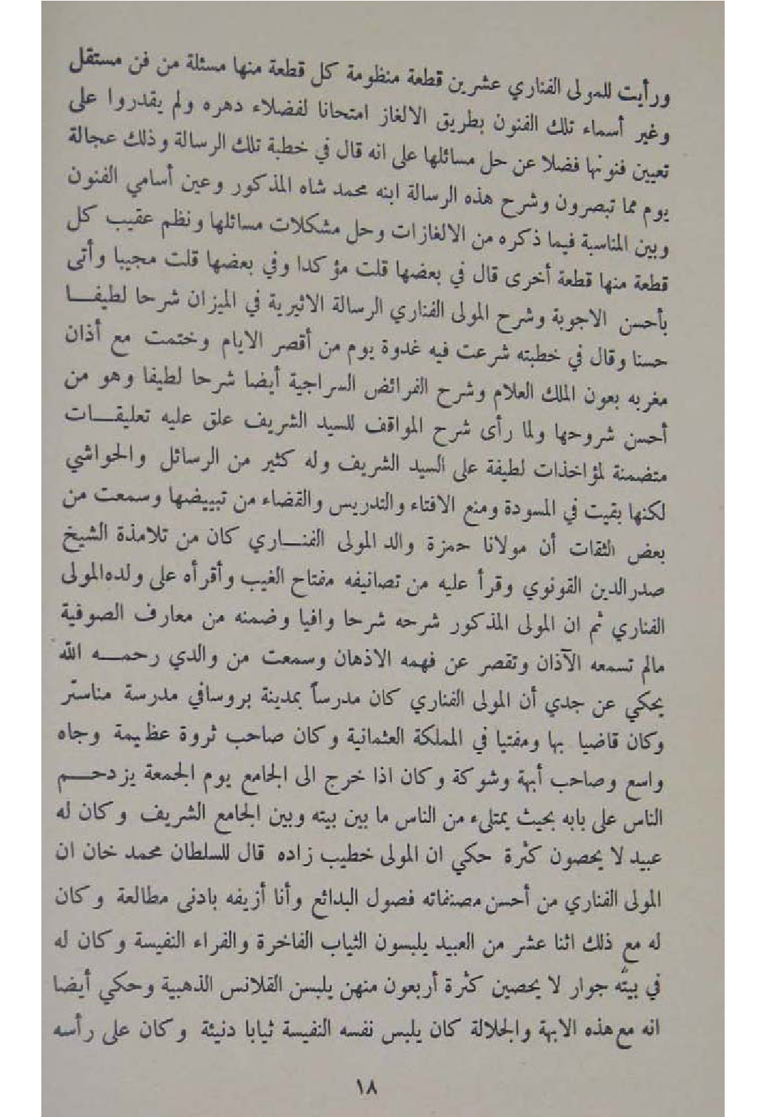 وَرَأَيْت للْمولى الفناري عشْرين قِطْعَة منظومة كل قِطْعَة مِنْهَا مسئلة من فن مُسْتَقل وَغير أَسمَاء تِلْكَ الْفُنُون بطرِيق الالغاز امتحانا لفضلاء دهره وَلم يقدروا على تعْيين فنونها فضلا عَن حل مسائلها على انه قَالَ فِي خطْبَة تِلْكَ الرسَالَة وَذَلِكَ عجالة يَوْم مِمَّا تبصرون وَشرح هَذِه الرسَالَة ابْنه مُحَمَّد شاه الْمَذْكُور وَعين اسامي الْفُنُون وَبَين الْمُنَاسبَة فِيمَا ذكره من الالغازات وَحل مشكلات مسائلها ونظم عقيب كل قِطْعَة مِنْهَا قِطْعَة اخرى قَالَ فِي بَعْضهَا قلت مؤكدا وَفِي بَعْضهَا قلت مجيبا وأتى بِأَحْسَن الاجوبة وَشرح الْمولى الفناري الرسَالَة الاثيرية فِي الْمِيزَان شرحا لطيفا حسنا وَقَالَ فِي خطبَته شرعت فِيهِ غدْوَة يَوْم من اقصر الايام وختمت مَعَ اذان مغربه بعون الْملك العلام وَشرح الْفَرَائِض السِّرَاجِيَّة أَيْضا شرحا لطيفا وهومن احسن شروحها وَلما رأى شرح المواقف للسَّيِّد الشريف علق عَلَيْهِ تعليقات متضمنة لمؤاخذات لَطِيفَة على السَّيِّد الشريف وَله كثير من الرسائل والحواشي لَكِنَّهَا بقيت فِي المسودة وَمنع الافتاء والتدريس وَالْقَضَاء من تبييضها وَسمعت من بعض الثِّقَات ان مَوْلَانَا حَمْزَة وَالِد الْمولى الفناري كَانَ من تلامذة الشَّيْخ صدر الدّين القونوي وَقَرَأَ عَلَيْهِ من تصانيفه مِفْتَاح الْغَيْب واقرأه على وَلَده الْمولى الفناري ثمَّ ان الْمولى الْمَذْكُور شَرحه شرحا وافيا وَضَمنَهُ من معارف الصُّوفِيَّة مالم تسمعه الاذان وتقصر عَن فهمه الاذهان وَسمعت من وَالِدي رَحمَه الله يَحْكِي عَن جدي ان الْمولى الفناري كَانَ مدرسا بِمَدِينَة بروسا فِي مدرسة مناستر وَكَانَ قَاضِيا بهَا ومفتيا فِي المملكة العثمانية وَكَانَ صَاحب ثروة عَظِيمَة وجاه وَاسع وَصَاحب ابهة وشوكة وَكَانَ إِذا خرج الى الْجَامِع يَوْم الْجُمُعَة يزدحم النَّاس على بَابه بِحَيْثُ يمتلىء من النَّاس مَا بَين بَيته وَبَين الْجَامِع الشريف وَكَانَ لَهُ عبيد لَا يُحصونَ كَثْرَة حُكيَ ان الْمولى خطيب زَاده قَالَ للسُّلْطَان مُحَمَّد خَان ان الْمولى الفناري من احسن مصنفاته فُصُول الْبَدَائِع وَأَنا ازيفه بادنى مطالعة وَكَانَ لَهُ مَعَ ذَلِك اثْنَا عشر من العبيد يلبسُونَ الثِّيَاب الفاخرة وَالْفراء النفيسة وَكَانَ لَهُ فِي بَيته جوَار لَا يحصين كَثْرَة اربعون مِنْهُنَّ يلبسن القلانس الذهبية وَحكي ايضا انه مَعَ هَذِه الابهة وَالْجَلالَة كَانَ يلبس نَفسه النفيسة ثيابًا دنيئة وَكَانَ على ر أسه