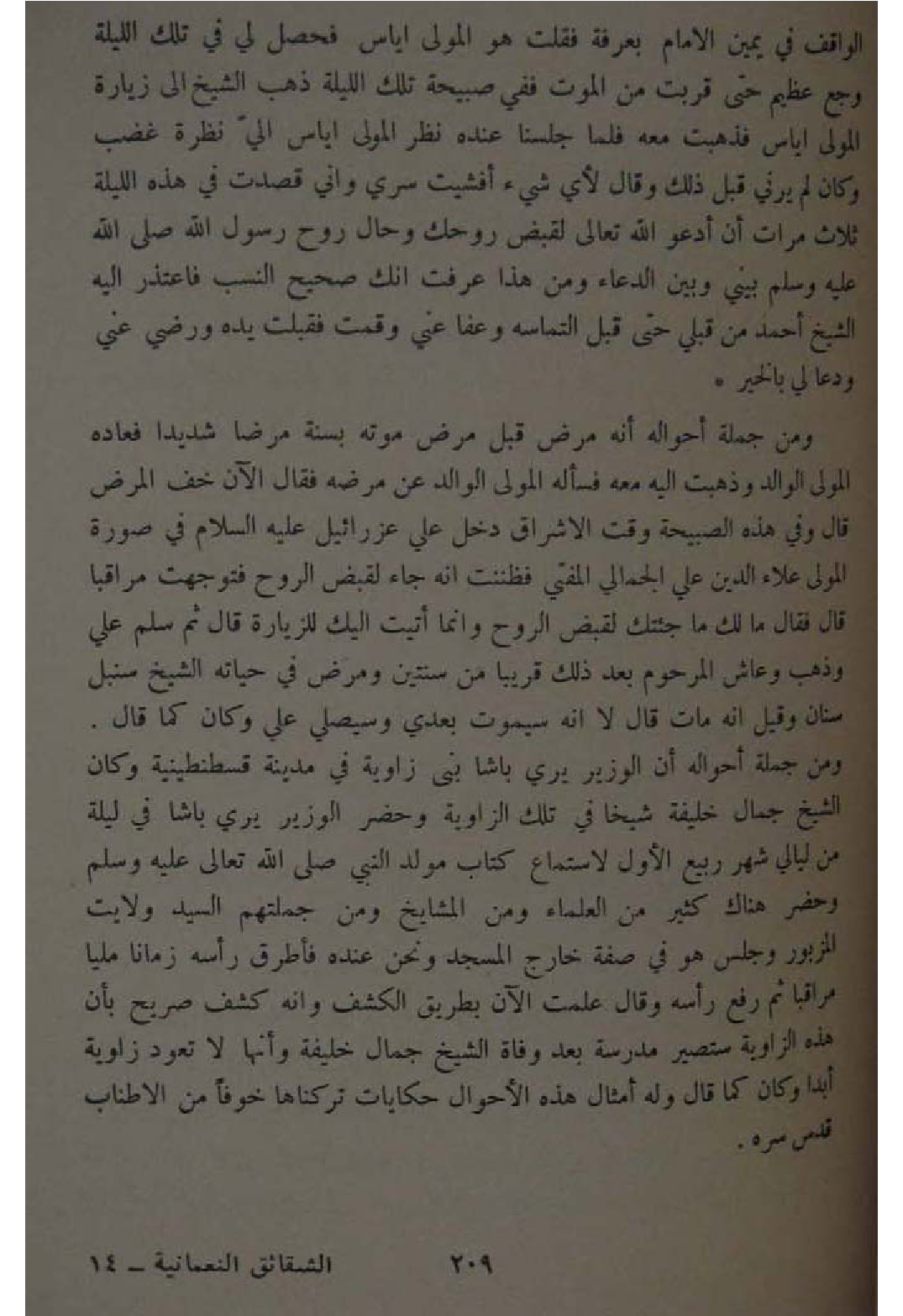 وَمن جملَة احواله انه مرض قبل مرض مَوته بِسنة مَرضا شَدِيدا فعاده الْمولى الْوَالِد وَذَهَبت اليه مَعَه فَسَأَلَهُ الْمولى الْوَالِد عَن مَرضه فَقَالَ الان خف الْمَرَض قَالَ وَفِي هَذِه الصبيحة وَقت الاشراق دخل عَليّ عزرائيل عَلَيْهِ السَّلَام فِي صُورَة الْمولى عَلَاء الدّين عَليّ الجمالي الْمُفْتِي فَظَنَنْت انه جَاءَ لقبض الرّوح فتوجهت مراقبا قَالَ فَقَالَ مَا لَك مَا جئْتُك لقبض الرّوح وانما اتيت اليك للزيارة قَالَ ثمَّ سلم عَليّ وَذهب وعاش المرحوم بعد ذَلِك قَرِيبا من سنتَيْن وَمرض فِي حَيَاته الشَّيْخ سنبل سِنَان وَقيل انه مَاتَ قَالَ لَا انه سيموت بعدِي وسيصلي عَليّ وَكَانَ كَمَا قَالَ وَمن جملَة احواله ان الْوَزير يري باشا بنى زَاوِيَة فِي مَدِينَة قسطنطينية وَكَانَ الشَّيْخ جمال خَليفَة شَيخا فِي تِلْكَ الزاوية وَحضر الْوَزير يري باشا فِي لَيْلَة من ليَالِي شهر ربيع الاول لاستماع كتاب مولد النَّبِي صلى الله عَلَيْهِ وَسلم وَحضر هُنَاكَ كثير من الْعلمَاء وَمن الْمَشَايِخ وَمن جُمْلَتهمْ السَّيِّد ولايت الْمَزْبُور وَجلسَ هُوَ فِي صفة خَارج الْمَسْجِد وَنحن عِنْده فَأَطْرَقَ رَأسه زَمَانا مَلِيًّا مراقبا ثمَّ رفع رَأسه وَقَالَ علمت الان بطرِيق الْكَشْف وانه كشف صَرِيح بِأَن هَذِه الزاوية ستصير مدرسة بعد وَفَاة الشَّيْخ جمال خَليفَة وانها لَا تعود زَاوِيَة ابدا وَكَانَ كَمَا قَالَ وَله امثال هَذِه الاحوال حكايات تركناها خوفًا من الاطناب قدس سره