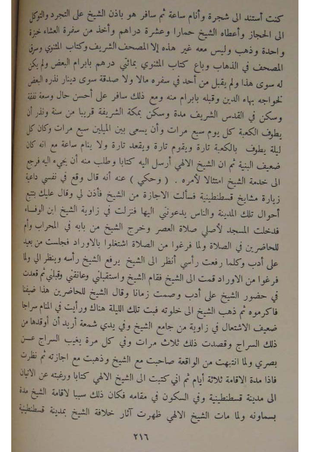 كنت اسْتندَ إِلَى شَجَرَة وأنام سَاعَة ثمَّ سَافر هُوَ باذن الشَّيْخ على التجرد والتوكل الى الْحجاز وَأَعْطَاهُ الشَّيْخ حمارا وَعشرَة دَرَاهِم وَأخذ من سفرة الْعشَاء خبْزَة وَاحِدَة وَذهب وَلَيْسَ مَعَه غير هَذِه الا الْمُصحف الشريف وَكتاب المثنوي وسرق الْمُصحف فِي الذّهاب وَبَاعَ كتاب المثنوي بِمِائَتي دِرْهَم بابرام الْبَعْض وَلم يكن لَهُ سوى هَذَا وَلم يقبل من اُحْدُ فِي سَفَره مَالا وَلَا صَدَقَة سوى دِينَار نَذره الْبَعْض لخواجه بهاء الدّين وَقَبله بابرام مِنْهُ وَمَعَ ذَلِك سَافر على أحسن حَال وسعة نَفَقَة وَسكن فِي الْقُدس الشريف مُدَّة وَسكن بِمَكَّة الشَّرِيفَة قَرِيبا من سنة وَنذر أَن يطوف الْكَعْبَة كل يَوْم سبع مَرَّات وَأَن يسْعَى بَين الميلين سبع مَرَّات وَكَانَ كل لَيْلَة يطوف بِالْكَعْبَةِ تَارَة وَيقوم تَارَة وَيقْعد تَارَة وَلَا ينَام سَاعَة مَعَ انه كَانَ ضَعِيف البنية ثمَّ ان الشَّيْخ الالهي ارسل اليه كتابا وَطلب مِنْهُ ان يَجِيء اليه فَرجع الى خدمَة الشَّيْخ امتثالا لأَمره وَحكي عَنهُ انه قَالَ وَقع فِي نَفسِي دَاعِيَة زِيَارَة مَشَايِخ قسطنطينية فَسَأَلت الاجازة من الشَّيْخ فَأذن لي وَقَالَ عَلَيْك بتتبع احوال تِلْكَ الْمَدِينَة وَالنَّاس يدعونني اليها فَنزلت فِي زَاوِيَة الشَّيْخ ابْن الْوَفَاء فَدخلت الْمَسْجِد لأصلي صَلَاة الْعَصْر وَخرج الشَّيْخ من بَابه فِي الْمِحْرَاب وَأم للحاضرين فِي الصَّلَاة وَلما فرغوا من الصَّلَاة اشتغلوا بالاوراد فَجَلَست من بعيد على أدب وَكلما رفعت راسي انْظُر الى الشَّيْخ يرفع الشَّيْخ رَأسه وَينظر الي وَلما فرغوا من الاوراد قُمْت الى الشَّيْخ فَقَامَ الشَّيْخ واستقبلني وعانقني وقبلني ثمَّ قعدت فِي حُضُور الشَّيْخ على أدب وَصمت زَمَانا وَقَالَ الشَّيْخ للحاضرين هَذَا ضيفنا فاكرموه ثمَّ ذهب الشَّيْخ الى خلوته فَبت تِلْكَ اللَّيْلَة هُنَاكَ وَرَأَيْت فِي الْمَنَام سِرَاجًا ضَعِيف الاشتعال فِي زَاوِيَة من جَامع الشَّيْخ وَفِي يَدي شمعة اريد أَن اوقدها من ذَلِك السراج وقصدت ذَلِك ثَلَاث مَرَّات وَفِي كل مرّة يغيب السراج عَن بَصرِي وَلما انْتَبَهت من الْوَاقِعَة صاحبت مَعَ الشَّيْخ وَذَهَبت مَعَ اجازته ثمَّ نظرت فَإِذا مُدَّة الاقامة ثَلَاثَة أَيَّام ثمَّ إِنِّي كتبت الى الشَّيْخ الالهي كتابا ورغبته عَن الاتيان الى مَدِينَة قسطنطينية وَفِي السّكُون فِي مقَامه فَكَانَ ذَلِك سَببا لاقامة الشَّيْخ مُدَّة بسماونه وَلما مَاتَ الشَّيْخ الالهي ظَهرت آثَار خلَافَة الشَّيْخ بِمَدِينَة قسطنطينية