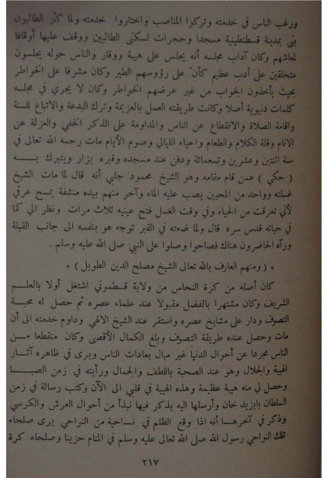 وَرغب النَّاس فِي خدمته وَتركُوا المناصب واختاروا خدمته وَلما كثر الطالبون بنى بِمَدِينَة قسطنطينية مَسْجِدا وحجرات لسكنى الطالبين ووقف عَلَيْهَا أوقافا لمعاشهم وَكَانَ آدَاب مَجْلِسه انه يجلس على هَيْبَة ووقار وَالنَّاس حوله يَجْلِسُونَ متحلقين على أدب عَظِيم كَأَن على رؤوسهم الطير وَكَانَ مشرفا على الخواطر بِحَيْثُ يَأْخُذُونَ الْجَواب من غير عرضهمْ الخواطر وَكَانَ لَا يجْرِي فِي مَجْلِسه كَلِمَات دنيوية أصلا وَكَانَت طَرِيقَته الْعَمَل بالعزيمة وَترك الْبِدْعَة والاتباع للسّنة واقامة الصَّلَاة والانقطاع عَن النَّاس والمداومة على الذّكر الْخَفي وَالْعُزْلَة عَن الانام وَقلة الْكَلَام وَالطَّعَام واحياء اللَّيَالِي وَصَوْم الايام مَاتَ رَحمَه الله تَعَالَى فِي سنة اثْنَتَيْنِ وَعشْرين وَتِسْعمِائَة وَدفن عِنْد مَسْجده وقبره يزار ويتبرك بِهِ حُكيَ عَمَّن قَامَ مقَامه وَهُوَ الشَّيْخ مَحْمُود جلبي انه قَالَ لما مَاتَ الشَّيْخ غسلته وَوَاحِد من المحبين يصب عَلَيْهِ المَاء وَآخر مِنْهُم بِيَدِهِ منشفة يمسح عرقي لِأَنِّي تعرقت من الْحيَاء وَفِي وَقت الْغسْل فتح عَيْنَيْهِ ثَلَاث مَرَّات وَنظر الي كَمَا فِي حَيَاته قدس سره قَالَ وَلما ضعته فِي الْقَبْر توجه هُوَ بِنَفسِهِ الى جَانب الْقبْلَة وَرَآهُ الْحَاضِرُونَ هُنَاكَ فصاحوا وصلوا على النَّبِي صلى الله عَلَيْهِ وَسلم