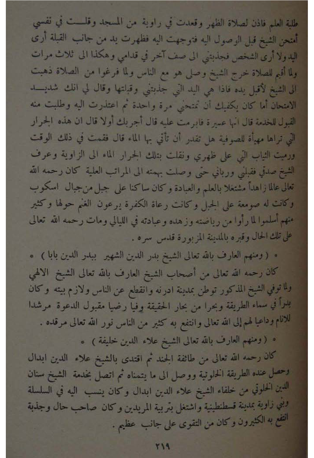 طلبة الْعلم فاذن لصَلَاة الظّهْر وَقَعَدت فِي راوية من الْمَسْجِد وَقلت فِي نَفسِي امتحن الشَّيْخ قبل الْوُصُول اليه فتوجهت اليه فظهرت يَد من جَانب الْقبْلَة أرى الْيَد وَلَا أرى الشَّخْص فجذبتني الى صف آخر فِي قدامي وَهَكَذَا الى ثَلَاث مَرَّات وَلما أقيم للصَّلَاة خرج الشَّيْخ وَصلى هُوَ مَعَ النَّاس وَلما فرغوا من الصَّلَاة ذهبت الى الشَّيْخ لأقبل يَده فَإِذا هِيَ الْيَد الَّتِي جذبتني وقبلتها وَقَالَ لي انك شَدِيد الامتحان اما كَانَ يَكْفِيك ان تمتحني مرّة وَاحِدَة ثمَّ اعتذرت اليه وَطلبت مِنْهُ الْقبُول للْخدمَة قَالَ انها عسيرة فابرمت عَلَيْهِ قَالَ اجربك اولا قَالَ ان هَذِه الجرار الَّتِي ترَاهَا مهيأة للصوفية هَل تقدر ان تَأتي بهَا المَاء قَالَ فَقُمْت فِي ذَلِك الْوَقْت ورميت الثِّيَاب الَّتِي على ظَهْري ونقلت بِتِلْكَ الجرار المَاء الى الزاوية وَعرف الشَّيْخ صدقي فقبلني ورباني حَتَّى وصلت بهمته الى الْمَرَاتِب الْعلية كَانَ رَحمَه الله تَعَالَى عَالما زاهدا مشتغلا بِالْعلمِ وَالْعِبَادَة وَكَانَ سَاكِنا على جبل من جبال اسكوب وَكَانَت لَهُ صومعة على الْجَبَل وَكَانَت رُعَاة الْكَفَرَة يرعون الْغنم حولهَا وَكثير مِنْهُم أَسْلمُوا لما رَأَوْا من رياضته وزهده وعبادته فِي اللَّيَالِي وَمَات رَحمَه الله تَعَالَى على تِلْكَ الْحَال وقبره بِالْمَدِينَةِ المزبورة قدس سره
