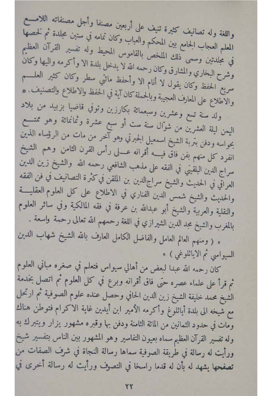 واللغة وَله تصانيف كَثِيرَة تنيف على اربعين مصنفا واجل مصنفاته اللامع الْمعلم العجاب الْجَامِع بَين الْمُحكم والعباب وَكَانَ تَمَامه فِي سِتِّينَ مجلدة ثمَّ لخصها فِي مجلدتين وسمى ذَلِك الملخص بالقاموس الْمُحِيط وَله تَفْسِير الْقُرْآن الْعَظِيم وَشرح البُخَارِيّ والمشارق وَكَانَ رَحمَه الله لَا يدْخل بَلْدَة الا وأكرمه واليها وَكَانَ سريع الْحِفْظ وَكَانَ يَقُول لَا أَنَام الا واحفظ مِائَتي سطر وَكَانَ كثير الْعلم والاطلاع على المعارف العجيبة وَبِالْجُمْلَةِ كَانَ آيَة فِي الْحِفْظ والاطلاع والتصنيف ولد سنة تسع وَعشْرين وَسَبْعمائة بكارزين وَتُوفِّي قَاضِيا بزبيد من بِلَاد الْيمن لَيْلَة الْعشْرين من شَوَّال سنة سِتّ اَوْ سبع عشرَة وَثَمَانمِائَة وَهُوَ ممتع بحواسه وَدفن بتربة الشَّيْخ اسمعيل الجبرتي وَهُوَ آخر من مَاتَ من الرؤساء الَّذين انْفَرد كل مِنْهُم بفن فاق فِيهِ اقرانه على رَأس الْقرن الثَّامِن وهم الشَّيْخ سراج الدّين البُلْقِينِيّ فِي الْفِقْه على مَذْهَب الشَّافِعِي رَحمَه الله وَالشَّيْخ زين الدّين الْعِرَاقِيّ فِي الحَدِيث وَالشَّيْخ سراج الدّين بن الملقن فِي كَثْرَة التصانيف فِي فن الْفِقْه والْحَدِيث وَالشَّيْخ شمس الدّين الفناري فِي الِاطِّلَاع على كل الْعُلُوم الْعَقْلِيَّة والنقلية والعربية وَالشَّيْخ ابو عبد الله بن عَرَفَة فِي فقه الْمَالِكِيَّة وَفِي سَائِر الْعُلُوم بالمغرب وَالشَّيْخ مجد الدّين الشِّيرَازِيّ فِي اللُّغَة رَحِمهم الله تَعَالَى رَحْمَة وَاسِعَة
