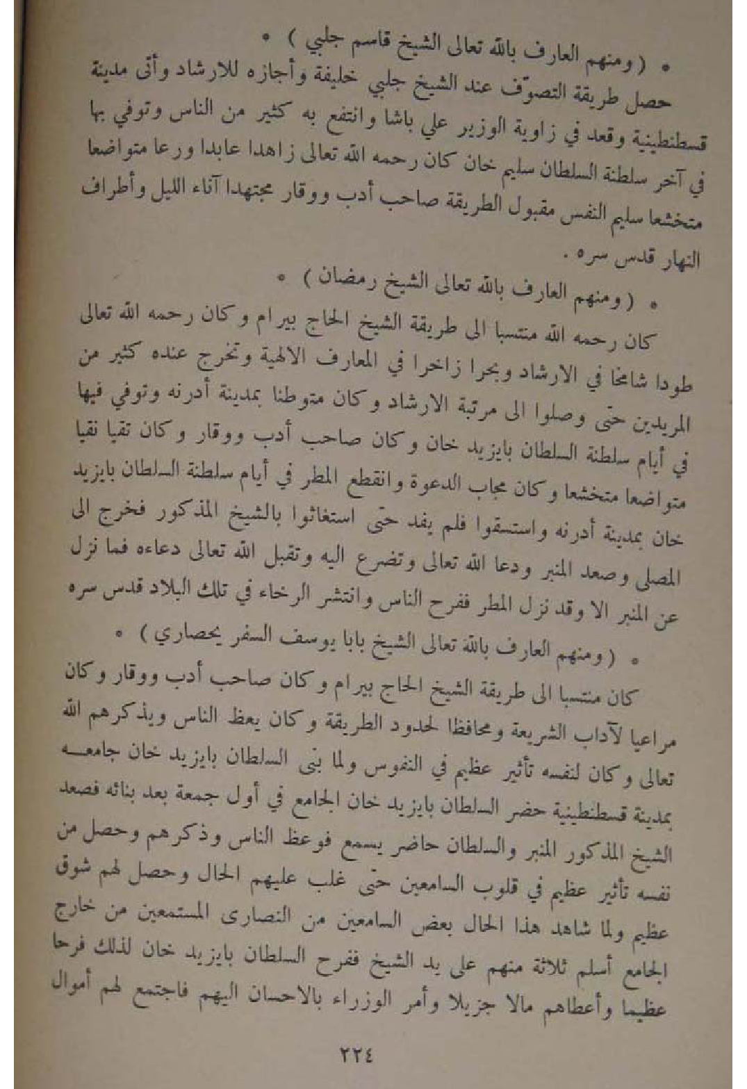 كَانَ منتسبا الى طَريقَة الشَّيْخ الْحَاج بيرام وَكَانَ صَاحب أدب ووقار وَكَانَ مراعيا لِآدَابِ الشَّرِيعَة ومحافظا لحدود الطَّرِيقَة وَكَانَ يعظ النَّاس وَيذكرهُمْ الله تَعَالَى وَكَانَ لنَفسِهِ تَأْثِير عَظِيم فِي النُّفُوس وَلما بنى السُّلْطَان بايزيدخان جَامِعَة بِمَدِينَة قسطنطينية حضر السُّلْطَان بايزيدخان الْجَامِع فِي اول جُمُعَة بعد بنائِهِ فَصَعدَ الشَّيْخ الْمَذْكُور الْمِنْبَر وَالسُّلْطَان حَاضر يسمع فوعظ النَّاس وَذكرهمْ وَحصل من نَفسه تَأْثِير عَظِيم فِي قُلُوب السامعين حَتَّى غلب عَلَيْهِم الْحَال وَحصل لَهُم شوق عَظِيم وَلما شَاهد هَذَا الْحَال بعض السامعين من النَّصَارَى المستمعين من خَارج الْجَامِع أسلم ثَلَاثَة مِنْهُم على يدالشيخ ففرح السُّلْطَان بايزيدخان لذَلِك فَرحا عَظِيما وَأَعْطَاهُمْ مَالا جزيلا وَأمر الوزراء بالاحسان اليهم فَاجْتمع لَهُم أَمْوَال