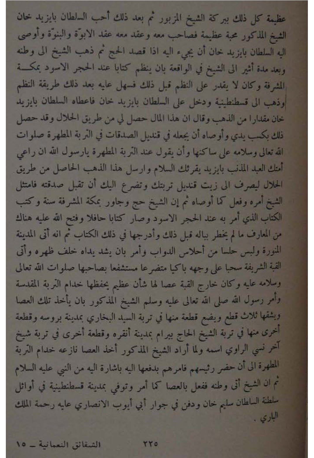 عَظِيمَة كل ذَلِك ببركة الشَّيْخ الْمَزْبُور ثمَّ بعد ذَلِك احب السُّلْطَان بايزيدخان الشَّيْخ الْمَذْكُور محبَّة عَظِيمَة فَصَاحب مَعَه وَعقد مَعَه عقدالابوة والبنوة وَأوصى اليه السُّلْطَان بايزيدخان ان يَجِيء اليه اذا قصدالحج ثمَّ ذهب الشَّيْخ الى وَطنه وَبعد مُدَّة أُشير الى الشَّيْخ فِي الْوَاقِعَة بَان ينظم كتابا عِنْد الْحجر الاسود بِمَكَّة المشرفة وَكَانَ لَا يقدر على النّظم قبل ذَلِك فسهل عَلَيْهِ بعد ذَلِك طَريقَة النّظم وَذهب الى قسطنطينية وَدخل على السُّلْطَان بايزيد خَان فاعطاه السُّلْطَان بايزيدخان مِقْدَارًا من الذَّهَب وَقَالَ ان هَذَا المَال حصل لي من طَرِيق الْحَلَال وَقد حصل ذَلِك بكسب يَدي وأوصاه ان يَجعله فِي قنديل الصَّدقَات فِي التربة المطهرة صلوَات الله تَعَالَى وَسَلَامه على ساكنها وَأَن يَقُول عِنْد التربة المطهرة يَا رَسُول الله ان راعي امتك العَبْد المذنب بايزيد يُقْرِئك السَّلَام وَأرْسل هَذَا الذَّهَب الْحَاصِل من طَرِيق الْحَلَال ليصرف الى زَيْت قنديل تربتك وتضرع اليك ان تقبل صدقته فامتثل الشَّيْخ امْرَهْ وَفعل كَمَا أوصاه ثمَّ ان الشَّيْخ حج وجاور بِمَكَّة المشرفة سنة وَكتب الْكتاب الَّذِي امْر بِهِ عندالحجر الاسود وَصَارَ كتابا حافلا وَفتح الله عَلَيْهِ هُنَاكَ من المعارف مَا لم يخْطر بِبَالِهِ قبل ذَلِك وأدرجها فِي ذَلِك الْكتاب ثمَّ انه أَتَى الْمَدِينَة المنورة وَلبس حلسا من أحلاس الدَّوَابّ وَأمر بَان يشد يَدَاهُ خلف ظَهره وأتى الْقبَّة الشَّرِيفَة سحبا على وَجهه باكيا متضرعا مستشفعا بصاحبها صلوَات الله تَعَالَى وَسَلَامه عَلَيْهِ وَكَانَ خَارج الْقبَّة عَصا لَهَا شان عَظِيم يحفظها خدام التربة المقدسة وَأمر رَسُول الله صلى الله عَلَيْهِ وَسلم الشَّيْخ الْمَذْكُور بَان يَأْخُذ تِلْكَ الْعَصَا ويشقها ثَلَاث قطع وَيَضَع قِطْعَة مِنْهَا فِي تربة السَّيِّد البُخَارِيّ بِمَدِينَة بروسه وَقطعَة اخرى مِنْهَا فِي تربة الشَّيْخ الْحَاج بيرام بِمَدِينَة انقره وَقطعَة اخرى فِي تربة شيخ آخر نسي الرَّاوِي اسْمه وَلما أَرَادَ الشَّيْخ الْمَذْكُور اخذ الْعَصَا نازعه خدام التربة المطهرة الى ان حضر رئيسهم فَأَمرهمْ بدفعها اليه باشارة اليه من النَّبِي عَلَيْهِ السَّلَام ثمَّ ان الشَّيْخ أَتَى وَطنه فَفعل بالعصا كَمَا أَمر وَتُوفِّي بِمَدِينَة قسطنطينية فِي أَوَائِل سلطنة السُّلْطَان سليم خَان وَدفن فِي جوَار ابي ايوب الانصاري عَلَيْهِ رَحْمَة الْملك الْبَارِي