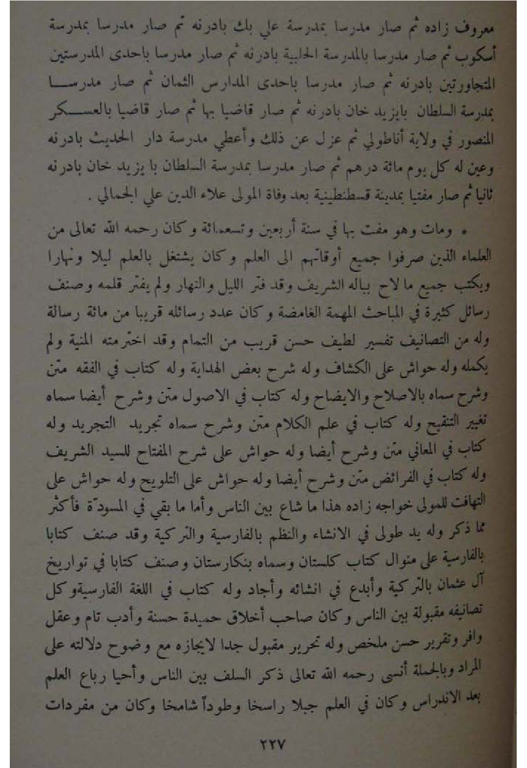 وَمَات وَهُوَ مفت بهَا فِي سنة اربعين وَتِسْعمِائَة وَكَانَ رَحمَه الله تَعَالَى من الْعلمَاء الَّذين صرفُوا جَمِيع اوقاتهم الى الْعلم وَكَانَ يشْتَغل بِالْعلمِ لَيْلًا وَنَهَارًا وَيكْتب جَمِيع مَا لَاحَ بِبَالِهِ الشريف وَقد فتر اللَّيْل وَالنَّهَار وَلم يفتر قلمه وصنف رسائل كَثِيرَة فِي المباحث المهمة الغامضة وَكَانَ عدد رسائله قَرِيبا من مائَة رِسَالَة وَله من التصانيف تَفْسِير لطيف حسن قريب من التَّمام وقداخترمته الْمنية وَلم يكمله وَله حواش على الْكَشَّاف وَله شرح بعض الْهِدَايَة وَله كتاب فِي الْفِقْه متن وَشرح سَمَّاهُ بالاصلاح والايضاح وَله كتاب فِي الاصول متن وَشرح ايضا سَمَّاهُ تَغْيِير التَّنْقِيح وَله كتاب فِي علم الْكَلَام متن وَشرح سَمَّاهُ تَجْرِيد التَّجْرِيد وَله كتاب فِي الْمعَانِي متن وَشرح ايضا وَله حواش على شرح الْمِفْتَاح للسَّيِّد الشريف وَله كتاب فِي الْفَرَائِض متن وَشرح ايضا وَله حواش على التَّلْوِيح وَله حواش على التهافت للْمولى خواجه زَاده هَذَا مَا شاع بَين النَّاس وَأما مَا بَقِي فِي المسودة فَأكْثر مِمَّا ذكر وَله يَد طولى فِي الانشاء وَالنّظم بِالْفَارِسِيَّةِ والتركية وَقد صنف كتابا بِالْفَارِسِيَّةِ على منوال كتاب كلستان وَسَماهُ بنكارستان وصنف كتابا فِي تواريخ آل عُثْمَان بالتركية وأبدع فِي إنشائه وأجاد وَله كتاب فِي اللُّغَة الفارسية وكل تصانيفه مَقْبُولَة بَين النَّاس وَكَانَ صَاحب اخلاق حميدة حَسَنَة وأدب تَامّ وعقل وافر وَتَقْرِير حسن ملخص وَله تَحْرِير مَقْبُول جدا لايجازه مَعَ وضوح دلَالَته على المُرَاد وَبِالْجُمْلَةِ انسى رَحمَه الله تَعَالَى ذكر السّلف بَين النَّاس وَأَحْيَا رباع الْعلم بعدالاندراس وَكَانَ فِي الْعلم جبلا راسخا وطودا شامخا وَكَانَ من مُفْرَدَات