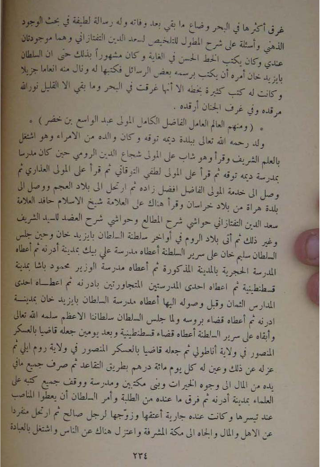 غرق اكثرها فِي الْبَحْر وَضاع مَا بَقِي بعد وَفَاته وَله رِسَالَة لَطِيفَة فِي بحث الْوُجُود الذهْنِي واسئلة على شرح المطول للتخليص لسعدالدين التَّفْتَازَانِيّ وهما موجودتان عِنْدِي وَكَانَ يكْتب الْخط الْحسن فِي الْغَايَة وَكَانَ مَشْهُورا بذلك حَتَّى ان السُّلْطَان بايزيدخان امْرَهْ ان يكْتب برسمه بعض الرسائل فكتبها لَهُ ونال مِنْهُ انعاما جزيلا وَكَانَت لَهُ كتب كَثِيرَة بِخَطِّهِ الا انها غرقت فِي الْبَحْر وَمَا بَقِي الا الْقَلِيل نور الله مرقده وَفِي غرف الْجنان أرقده