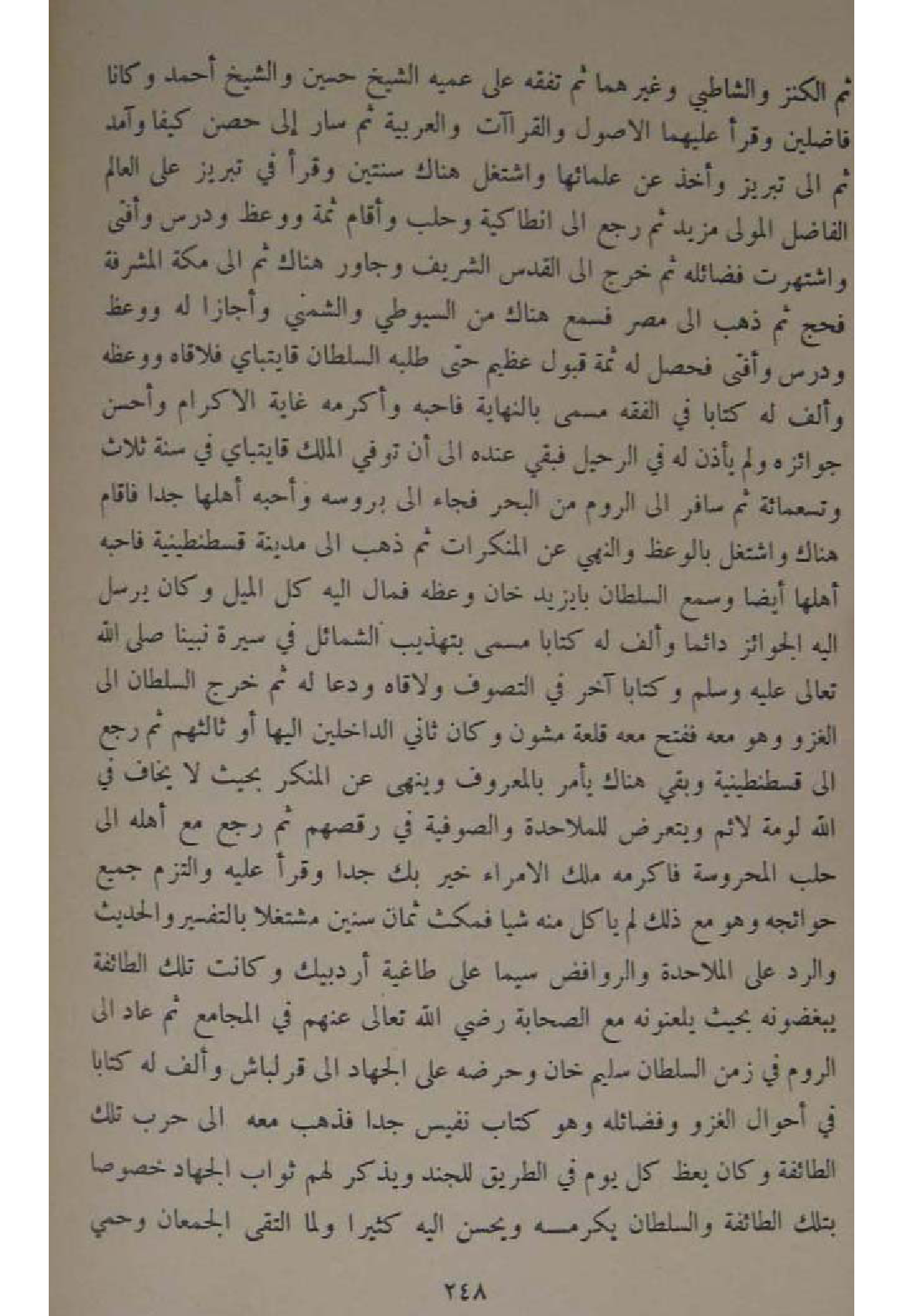 ثمَّ الْكَنْز والشاطبي وَغَيرهمَا ثمَّ تفقه على عميه الشَّيْخ حُسَيْن وَالشَّيْخ احْمَد وَكَانَا فاضلين وقرا عَلَيْهِمَا الاصول والقراآت والعربية ثمَّ سَار الى حصن كيفا وآمد ثمَّ الى تبريز وَأخذ عَن علمائها واشتغل هُنَاكَ سنتَيْن وقرا فِي تبريز على الْعَالم الْفَاضِل الْمولى مزِيد ثمَّ رَجَعَ الى انطاكية وحلب وَأقَام ثمَّة وَوعظ ودرس وَأفْتى واشتهرت فضائله ثمَّ خرج الى الْقُدس الشريف وجاور هُنَاكَ ثمَّ الى مَكَّة المشرفة فحج ثمَّ ذهب الى مصر فَسمع هُنَاكَ من السُّيُوطِيّ والشمني وأجازا لَهُ وَوعظ ودرس وَأفْتى فَحصل لَهُ ثمَّة قبُول عَظِيم حَتَّى طلبه السُّلْطَان قايتباي فلاقاه ووعظه وَألف لَهُ كتابا فِي الْفِقْه مُسَمّى بالنهاية فاحبه واكرمه غَايَة الاكرام وَأحسن جوائزه وَلم يَأْذَن لَهُ فِي الرحيل فَبَقيَ عِنْده الى ان توفّي الْملك قايتباي فِي سنة ثَلَاث وَتِسْعمِائَة ثمَّ سَافر الى الرّوم من الْبَحْر فجَاء الى بروسه وأحبه اهلها جدا فاقام هُنَاكَ واشتغل بالوعظ وَالنَّهْي عَن الْمُنْكَرَات ثمَّ ذهب الى مَدِينَة قسطنطينية فاحبه اهلها ايضا وَسمع السُّلْطَان بايزيدخان وعظه فَمَال اليه كل الْميل وَكَانَ يُرْسل اليه الجوائز دَائِما وَألف لَهُ كتابا مُسَمّى بتهذيب الشَّمَائِل فِي سيرة نَبينَا صلى الله تَعَالَى عَلَيْهِ وَسلم وكتابا آخر فِي التصوف ولاقاه ودعا لَهُ ثمَّ خرج السُّلْطَان الى الْغَزْو وَهُوَ مَعَه فَفتح مَعَه قلعة مشون وَكَانَ ثَانِي الداخلين اليها اَوْ ثالثهم ثمَّ رَجَعَ الى قسطنطينية وَبَقِي هُنَاكَ يامر بِالْمَعْرُوفِ وَينْهى عَن الْمُنكر بِحَيْثُ لَا يخَاف فِي الله لومة لائم ويتعرض للملاحدة والصوفية فِي رقصهم ثمَّ رَجَعَ مَعَ اهله الى حلب المحروسة فاكرمه ملك الامراء خير بك جدا وَقَرَأَ عَلَيْهِ وَالْتزم جَمِيع حَوَائِجه وَهُوَ مَعَ ذَلِك لم يَأْكُل مِنْهُ شيا فَمَكثَ ثَمَان سِنِين مشتغلا بالتفسير والْحَدِيث وَالرَّدّ على الْمَلَاحِدَة وَالرَّوَافِض سِيمَا على طاغية اردبيك وَكَانَت تِلْكَ الطَّائِفَة يبغضونه بِحَيْثُ يلعنونه مَعَ الصَّحَابَة رَضِي الله تَعَالَى عَنْهُم فِي المجامع ثمَّ عَاد الى الرّوم ثمَّ زمن السُّلْطَان سليم خَان وحرضه على الْجِهَاد الى قرلباش وَألف لَهُ كتابا فِي أَحْوَال الْغَزْو وفضائله وَهُوَ كتاب نَفِيس جدا فَذهب مَعَه الى حَرْب تِلْكَ الطَّائِفَة وَكَانَ يعظ كل يَوْم فِي الطَّرِيق للجند وَيذكر لَهُم ثَوَاب الْجِهَاد خُصُوصا بِتِلْكَ الطَّائِفَة وَالسُّلْطَان يُكرمهُ وَيحسن اليه كثيرا وَلما التقى الْجَمْعَانِ وحمي