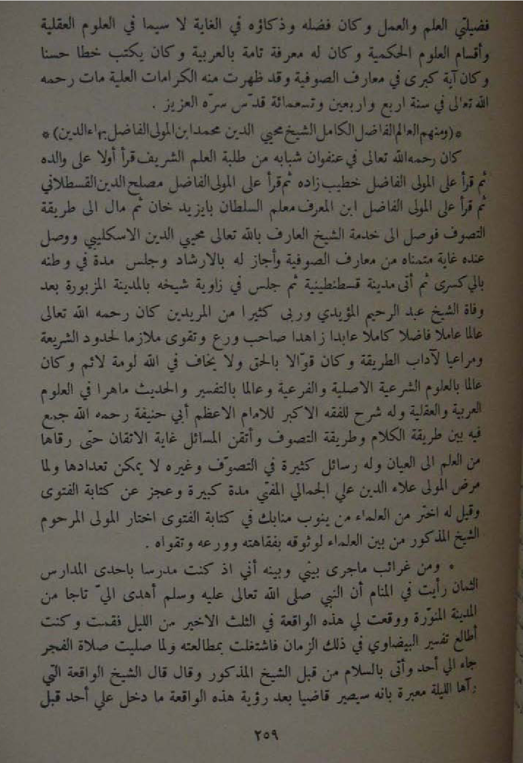 وَمن غرائب مَا جرى بيني وَبَينه أَنِّي اذ كنت مدرسا باحدى الْمِدْرَاس الثمان رَأَيْت فِي الْمَنَام ان النَّبِي صلى الله تَعَالَى عَلَيْهِ وَسلم اهدى الي تاجا من الْمَدِينَة المنورة وَوَقعت لي هَذِه الْوَاقِعَة فِي الثُّلُث الاخير من اللَّيْل فَقُمْت وَكنت اطالع تَفْسِير الْبَيْضَاوِيّ فِي ذَلِك الزَّمَان فاشتغلت بمطالعته وَلما صليت صَلَاة الْفجْر جَاءَ الي اُحْدُ واتى بِالسَّلَامِ من قبل الشَّيْخ الْمَذْكُور وَقَالَ قَالَ الشَّيْخ الْوَاقِعَة الَّتِي رَآهَا اللَّيْلَة معبرة بانه سيصير قَاضِيا بعد رُؤْيَة هَذِه الْوَاقِعَة مَا دخل عَليّ اُحْدُ قبل