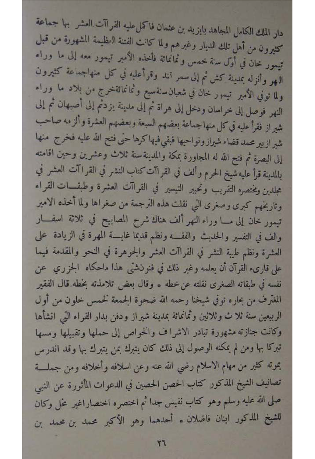 دَار الْملك الْكَامِل الْمُجَاهِد بايزيد بن عُثْمَان فأكمل عَلَيْهِ القراآت الْعشْر بهَا جمَاعَة كَثِيرُونَ من اهل تِلْكَ الديار وَغَيرهم وَلما كَانَت الْفِتْنَة الْعَظِيمَة الْمَشْهُورَة من قبل تيمور خَان فِي أول سنة خمس وَثَمَانمِائَة فَأَخذه الامير تيمور مَعَه الى مَا وَرَاء النَّهر وأنزله بِمَدِينَة كش ثمَّ الى سَمَرْقَنْد وقرا عَلَيْهِ فِي كل مِنْهَا جمَاعَة كَثِيرُونَ وَلما توفّي الامير تيمور خَان فِي شعْبَان سنة سبع وَثَمَانمِائَة خرج من بِلَاد مَا وَرَاء النَّهر فوصل الى خُرَاسَان وَدخل الى هراة ثمَّ الى مَدِينَة يزدْ ثمَّ الى اصبهان ثمَّ الى شيراز فقرا عيه فِي كل مِنْهَا جمَاعَة بَعضهم السَّبْعَة وَبَعْضهمْ الْعشْرَة وألزمه صَاحب شيرازبير مُحَمَّد قَضَاء شيراز ونواحيها فَبَقيَ فِيهَا كرها حَتَّى فتح الله عَلَيْهِ فَخرج مِنْهَا الى الْبَصْرَة ثمَّ فتح الله لَهُ الْمُجَاورَة بِمَكَّة وَالْمَدينَة سنة ثَلَاث وَعشْرين وَحين اقامته بِالْمَدِينَةِ قَرَأَ عَلَيْهِ شيخ الْحرم وَألف فِي القراآت كتاب النشر فِي القراآت الْعشْر فِي مجلدين ومختصره التَّقْرِيب وتحبير التَّيْسِير فِي القراآت الْعشْرَة وطبقات الْقُرَّاء وتاريخهم كبرى وصغرى الَّتِي نقلت هَذِه التَّرْجَمَة من صغراها وَلما أَخذه الامير تيمور خَان الى مَا وَرَاء النَّهر ألف هُنَاكَ شرح المصابيح فِي ثَلَاثَة اسفار وَألف فِي التَّفْسِير والْحَدِيث وَالْفِقْه ونظم قَدِيما غَايَة المهرة فِي الزِّيَادَة على الْعشْرَة ونظم طيبَة النشر فِي القراآت الْعشْر والجوهرة فِي النَّحْو والمقدمة فِيمَا على قَارِئ الْقُرْآن ان يُعلمهُ وَغير ذَلِك فِي فنون شَتَّى هَذَا مَا حَكَاهُ الْجَزرِي عَن نَفسه فِي طبقاته الصُّغْرَى نقلته عَن خطه وَقَالَ بعض تلامذته بِخَطِّهِ قَالَ الْفَقِير المغترف من بحاره توفّي شَيخنَا رَحمَه الله ضحوة الْجُمُعَة لخمس خلون من أول الربيعين سنة ثَلَاث وَثَلَاثِينَ وَثَمَانمِائَة بِمَدِينَة شيراز وَدفن بدار الْقُرَّاء الي انشأها وَكَانَت جنَازَته مَشْهُورَة تبادر الاشراف والخواص الى حملهَا وتقبيلها ومسها تبركا بهَا وَمن لم يُمكنهُ الْوُصُول الى ذَلِك كَانَ يتبرك بِمن يتبرك بهَا وَقد اندرس بِمَوْتِهِ كثير من مهام الاسلام رَضِي الله عَنهُ وَعَن اسلافه واخلافه وَمن جملَة تصانيف الشَّيْخ الْمَذْكُور كتاب الْحصن الْحصين فِي الدَّعْوَات الماثورة عَن النَّبِي صلى الله عَلَيْهِ وَسلم وَهُوَ كتاب نَفِيس جدا ثمَّ اخْتَصَرَهُ اختصارا غير مخل وَكَانَ للشَّيْخ الْمَذْكُور ابْنَانِ فاضلان احدهما وَهُوَ الاكبر مُحَمَّد بن مُحَمَّد بن