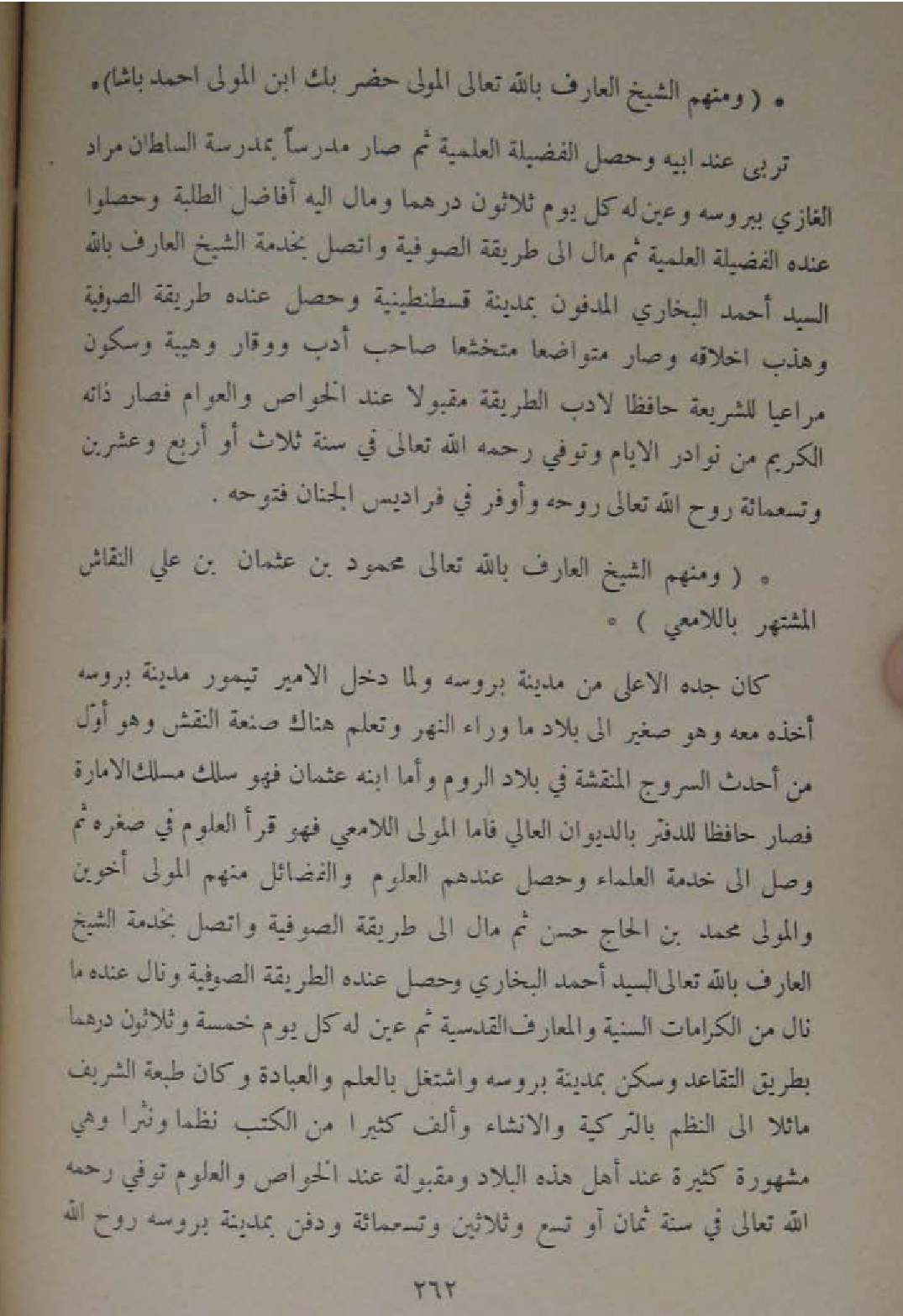 تربى عندا بيه وَحصل الْفَضِيلَة العلمية ثمَّ صَار مدرسا بمدرسة السُّلْطَان مُرَاد الْغَازِي ببروسه وَعين لَهُ كل يَوْم ثَلَاثُونَ درهما وَمَال اليه أفاضل الطّلبَة وحصلوا عِنْده الْفَضِيلَة العلمية ثمَّ مَال الى طَريقَة الصُّوفِيَّة واتصل بِخِدْمَة الشَّيْخ الْعَارِف بِاللَّه السَّيِّد احْمَد البُخَارِيّ المدفون بِمَدِينَة قسطنطينية وَحصل عِنْده طَريقَة الصُّوفِيَّة وهذب اخلاقه وَصَارَ متواضعا متخشعا صَاحب ادب ووقار وهيبة وَسُكُون مراعيا للشريعة حَافِظًا لادب الطَّرِيقَة مَقْبُولًا عندالخواص والعوام فَصَارَ ذَاته الْكَرِيم من نَوَادِر الايام وَتُوفِّي رَحمَه الله تَعَالَى فِي سنة ثَلَاث اَوْ أَربع وَعشْرين وَتِسْعمِائَة روح الله تَعَالَى روحه وأوفر فِي فراديس الْجنان فتوحه