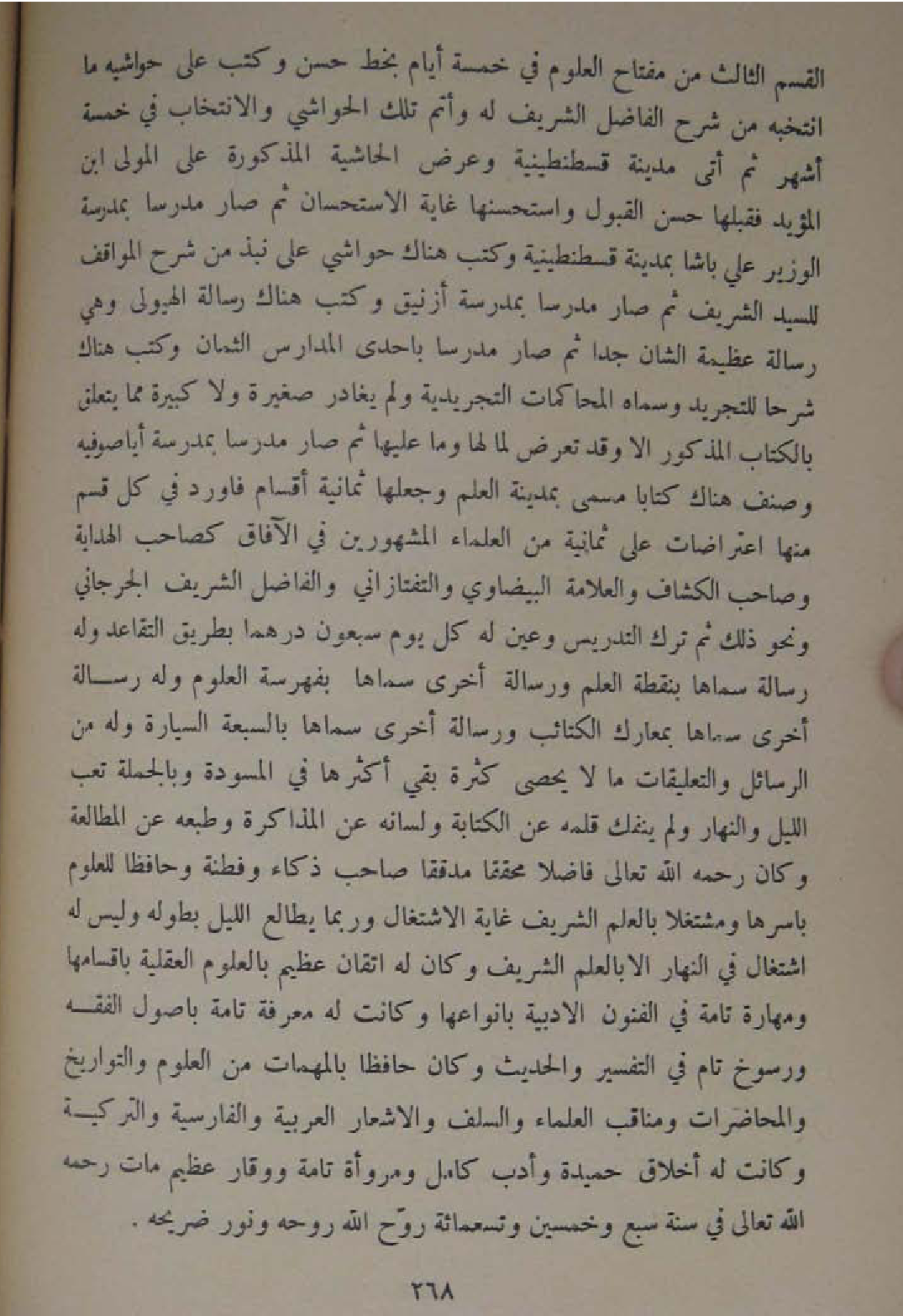 الْقسم الثَّالِث من مِفْتَاح الْعُلُوم فِي خَمْسَة ايام بِخَط حسن وَكتب على حَوَاشِيه مَا انتخبه من شرح الْفَاضِل الشريف لَهُ وَأتم تِلْكَ الْحَوَاشِي والانتخاب فِي خَمْسَة اشهر ثمَّ اتى مَدِينَة قسطنطينية وَعرض الْحَاشِيَة الْمَذْكُورَة على الْمولى ابْن الْمُؤَيد فقبلها حسن الْقبُول واستحسنها غَايَة الِاسْتِحْسَان ثمَّ صَار مدرسا بمدرسة الْوَزير عَليّ باشا بِمَدِينَة قسطنطينية وَكتب هُنَاكَ حَوَاشِي على نبذ من شرح المواقف للسيدالشريف ثمَّ صَار مدرسا بمدرسة ازنيق وَكتب هُنَاكَ رِسَالَة الهيولي وَهِي رِسَالَة عَظِيمَة الشان جدا ثمَّ صَار مدرسا بِإِحْدَى الْمِدْرَاس الثمان وَكتب هُنَاكَ شرحا للتجريد وَسَماهُ المحاكمات التجريدية وَلم يُغَادر صَغِيرَة وَلَا كَبِيرَة مِمَّا يتَعَلَّق بِالْكتاب الْمَذْكُور الا وَقد تعرض لما لَهَا وَمَا عَلَيْهَا ثمَّ صَار مدرسا بمدرسة ايا صوفيه وصنف هُنَاكَ كتابا مُسَمّى بِمَدِينَة الْعلم وَجعلهَا ثَمَانِيَة أَقسَام فاورد فِي كل قسم مِنْهَا اعتراضات على ثَمَانِيَة من الْعلمَاء الْمَشْهُورين فِي الافاق كصاحب الْهِدَايَة وَصَاحب الْكَشَّاف والعلامة الْبَيْضَاوِيّ والتفتازاني والفاضل الشريف الْجِرْجَانِيّ وَنَحْو ذَلِك ثمَّ ترك التدريس وَعين لَهُ كل يَوْم سَبْعُونَ درهما بطرِيق التقاعد وَله رِسَالَة سَمَّاهَا بِنُقْطَة الْعلم ورسالة اخرى سَمَّاهَا بفهرسة الْعُلُوم وَله رِسَالَة اخرى سَمَّاهَا بمعارك الْكَتَائِب ورسالة اخرى سَمَّاهَا بالسبعة السيارة وَله من الرسائل والتعليقات مَالا يُحْصى كَثْرَة بَقِي اكثرها فِي المسودة وَبِالْجُمْلَةِ تَعب اللَّيْل وَالنَّهَار وَلم يَنْفَكّ قلمه عَن الْكِتَابَة وَلسَانه عَن المذاكرة وطبعه عَن المطالعة وَكَانَ رَحمَه الله تَعَالَى فَاضلا محققا مدققا صَاحب ذكاء وفطنة وحافظا للعلوم باسرها ومشتغلا بِالْعلمِ الشريف غَايَة الِاشْتِغَال وَرُبمَا يطالع اللَّيْل بِطُولِهِ وَلَيْسَ لَهُ اشْتِغَال فِي النَّهَار الا بِالْعلمِ الشريف وَكَانَ لَهُ اتقان عَظِيم بالعلوم الْعَقْلِيَّة باقسامها ومهارة تَامَّة فِي الْفُنُون الادبية بانواعها وَكَانَت لَهُ معرفَة تَامَّة باصول الْفِقْه ورسوخ تَامّ فِي التَّفْسِير والْحَدِيث وَكَانَ حَافِظًا بالمهات من الْعُلُوم والتواريخ والمحاضرات ومناقب الْعلمَاء وَالسَّلَف والاشعار الْعَرَبيَّة والفارسية والتركية وَكَانَت لَهُ اخلاق حميدة وأدب كَامِل ومروأة تَامَّة ووقار عَظِيم مَاتَ رَحمَه الله تَعَالَى فِي سنة سبع وَخمسين وَتِسْعمِائَة روح الله روحه وَنور ضريحه