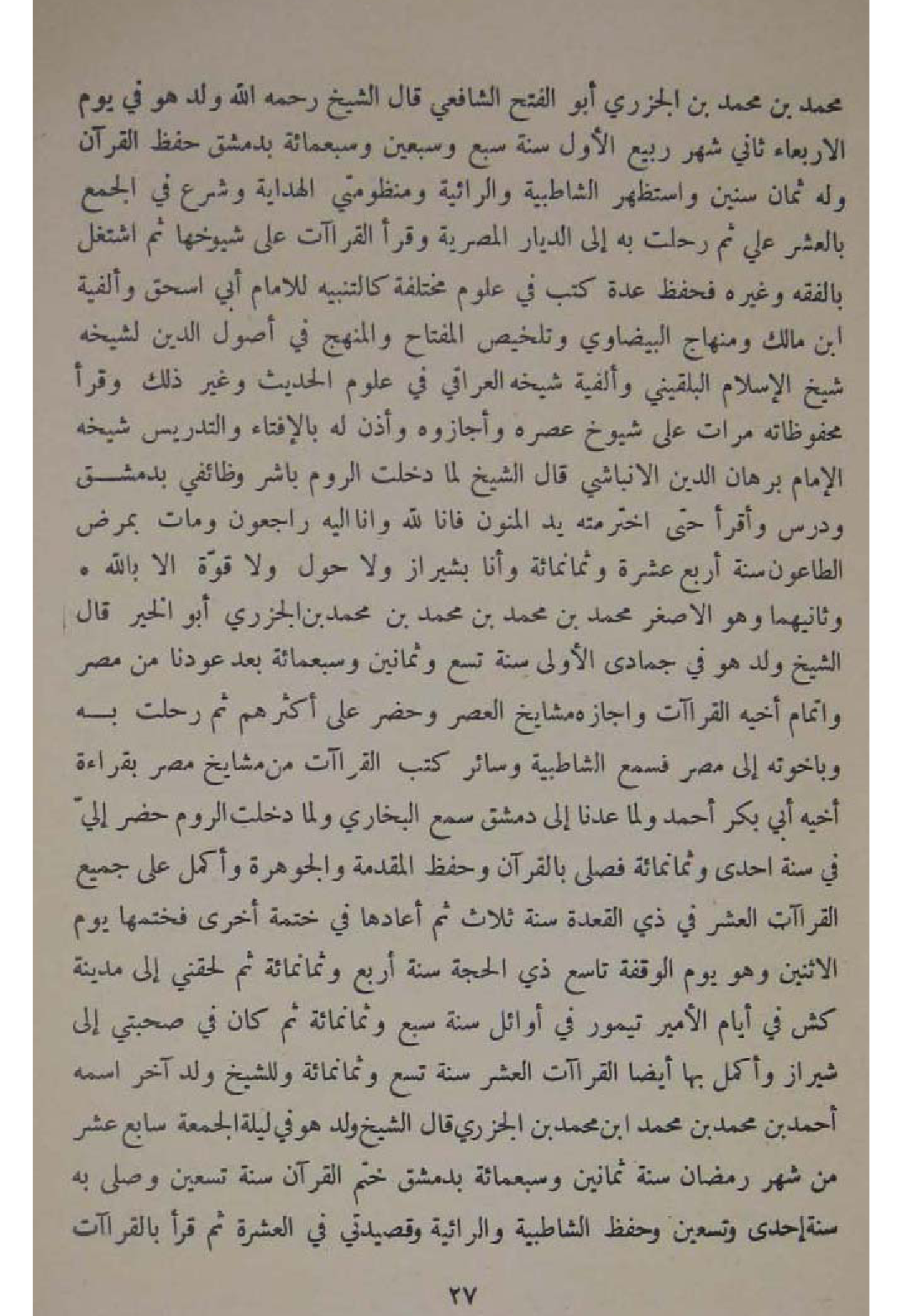 مُحَمَّد بن مُحَمَّد بن الْجَزرِي ابو الْفَتْح الشَّافِعِي قَالَ الشَّيْخ رَحمَه الله ولد هُوَ فِي يَوْم الاربعاء ثَانِي شهر ربيع الاول سنة سبع وَسبعين وَسَبْعمائة بِدِمَشْق حفظ الْقُرْآن وَله ثَمَان سِنِين وَاسْتظْهر الشاطبية والرائية ومنظومتي الْهِدَايَة وَشرع فِي الْجمع بالعشر عَليّ ثمَّ رحلت بِهِ الى الديار المصرية وقرا القراآت على شيوخها ثمَّ اشْتغل بالفقه وَغَيره فحفظ عدَّة كتب فِي عُلُوم مُخْتَلفَة كالتنبيه للامام ابي اسحق والفية ابْن مَالك ومنهاج الْبَيْضَاوِيّ وتلخيص الْمِفْتَاح والمنهج فِي أصُول الدّين لشيخه شيخ الاسلام البُلْقِينِيّ وألفية شَيْخه الْعِرَاقِيّ فِي عُلُوم الحَدِيث وَغير ذَلِك وَقَرَأَ محفوظاته مَرَّات على شُيُوخ عصره واجازوه وَأذن لَهُ بالافتاء والتدريس شَيْخه الامام برهَان الدي الانباشي قَالَ الشَّيْخ لما دخلت الرّوم بَاشر وظائفي بِدِمَشْق ودرس وأقرا حَتَّى اخترمته يَد الْمنون فانا لله وانا اليه رَاجِعُون وَمَات بِمَرَض الطَّاعُون سنة ارْبَعْ عشرَة وَثَمَانمِائَة وَأَنا بشيراز وَلَا حول وَلَا قُوَّة الا بِاللَّه وَثَانِيهمَا وَهُوَ الاصغر مُحَمَّد بن مُحَمَّد بن مُحَمَّد بن مُحَمَّد بن الْجَزرِي ابو الْخَيْر قَالَ الشَّيْخ ولد هُوَ فِي جمادي الاولى سنة تسع وَثَمَانِينَ وَسَبْعمائة بعد عودنا من مصر واتمام اخيه القراآت وَأَجَازَهُ مَشَايِخ الْعَصْر وَحضر على أَكْثَرهم ثمَّ رحلت بِهِ وباخوته الى مصر فَسمع الشاطبية وَسَائِر كتب القراآت من مَشَايِخ مصر بِقِرَاءَة اخيه ابي بكر احْمَد وَلما عدنا الى دمشق سمع البُخَارِيّ وَلما دخلت الرّوم حضر الي فِي سنة احدى وَثَمَانمِائَة فصلى بِالْقُرْآنِ وَحفظ الْمُقدمَة والجوهرة وأكمل على جَمِيع القراآت الْعشْر فِي ذِي الْقعدَة سنة ثَلَاث ثمَّ اعادها فِي ختمة اخرى فختمها يَوْم الِاثْنَيْنِ وَهُوَ يَوْم الوقفة تَاسِع ذِي الْحجَّة سنة ارْبَعْ وَثَمَانمِائَة ثمَّ لحقنى إِلَى مَدِينَة كش فِي أَيَّام الْأَمِير تيمور فِي اوائل سنة سبع وَثَمَانمِائَة ثمَّ كَانَ فِي صحبتي الى شيراز وأكمل بهَا أَيْضا القراآت الْعشْر سنة تسع وَثَمَانمِائَة وللشيخ ولد آخر اسْمه احْمَد بن مُحَمَّد بن مُحَمَّد ابْن مُحَمَّد بن الْجَزرِي قَالَ الشَّيْخ ولد هُوَ فِي لَيْلَة الْجُمُعَة سَابِع عشر من شهر رَمَضَان سنة ثَمَانِينَ وَسَبْعمائة بِدِمَشْق ختم الْقُرْآن سنة تسعين وَصلى بِهِ سنة احدى وَتِسْعين وَحفظ الشاطبية والرائية وقصيدتي فِي الْعشْرَة ثمَّ قرا بالقراآت