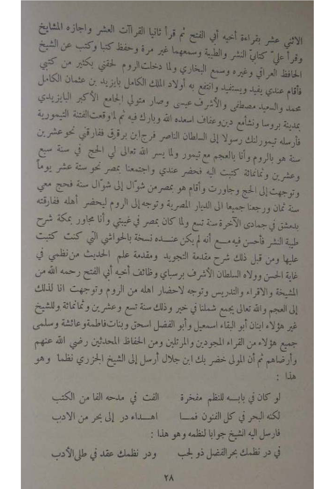 الاثْنَي عشر بِقِرَاءَة أَخِيه ابي الْفَتْح ثمَّ قَرَأَ ثَانِيًا القراآت الْعشْر واجازه الْمَشَايِخ وقرا عَليّ كتابي النشر والطيبة وسمعهما غير مرّة وَحفظ كتبا وَكتب عَن الشَّيْخ الْحَافِظ الْعِرَاقِيّ وَغَيره وَسمع البُخَارِيّ وَلما دخلت الرّوم لَحِقَنِي بِكَثِير من كتبي فَأَقَامَ عِنْدِي يُفِيد ويستفيد وانتفع بِهِ اولاد الْملك الْكَامِل بايزيد بن عُثْمَان الْكَامِل مُحَمَّد والسعيد مصطفى والاشرف عِيسَى وَصَارَ مُتَوَلِّي الْجَامِع الاكبر البيزيدي بِمَدِينَة بروسا وَنَشَأ مَعَ دين وعفاف اسعده الله وَبَارك فِيهِ ثمَّ لما وَقعت الْفِتْنَة التيمورية فَأرْسلهُ تيمورلنك رَسُولا الى السُّلْطَان النَّاصِر فرج ابْن برقوق ففارقني نَحْو عشْرين سنة هُوَ بالروم وَأَنا بالعجم مَعَ تيمور وَلما يسر الله تَعَالَى لي الْحَج فِي سنة سبع وَعشْرين وَثَمَانمِائَة كتبت اليه فَحَضَرَ عِنْدِي واجتمعنا بِمصْر نَحْو سِتَّة عشر يَوْمًا وتوجهت الى الْحَج وجاورت واقام هُوَ بِمصْر من شَوَّال الى شَوَّال سنة فحج معي سنة ثَمَان ورجعنا جَمِيعًا الى الديار المصرية وَتوجه الى الرّوم ليحضر اهله ففارقته بِدِمَشْق فِي جمادي الاخرة سنة تسع وَلما كَانَ بِمصْر فِي غيبتي وانا مجاور بِمَكَّة شرح طيبَة النشر فَأحْسن فِيهِ مَعَ انه لم يكن عِنْده نُسْخَة بالحواشي الَّتِي كنت كتبت عَلَيْهَا وَمن قبل ذَلِك شرح مُقَدّمَة التجويد ومقدمة علم الحَدِيث من نظمي فِي غَايَة الْحسن وولاه السُّلْطَان الاشرف برسباي وظائف أَخِيه ابي الْفَتْح رَحمَه الله من المشيخة والاقراء والتدريس وَتوجه لاحضار اهله من الرّوم وتوجهت انا لذَلِك الى الْعَجم وَالله تَعَالَى يجمع شملنا فِي خير وَذَلِكَ سنة تسع وَعشْرين وَثَمَانمِائَة وللشيخ غير هَؤُلَاءِ ابْنَانِ ابو الْبَقَاء اسمعيل وَأَبُو الْفضل اسحق وَبَنَات فَاطِمَة وَعَائِشَة وسلمى جَمِيع هَؤُلَاءِ من الْقُرَّاء المجودين والمرتلين وَمن الْحفاظ الْمُحدثين رَضِي الله عَنْهُم وأرضاهم ثمَّ ان الْمولى خضر بك ابْن جلال ارسل الى الشَّيْخ الْجَزرِي نظما وَهُوَ هَذَا ... لَو كَانَ فِي بَابه للنظم مفرخة ... الفت فِي مدحه الْفَا من الْكتب