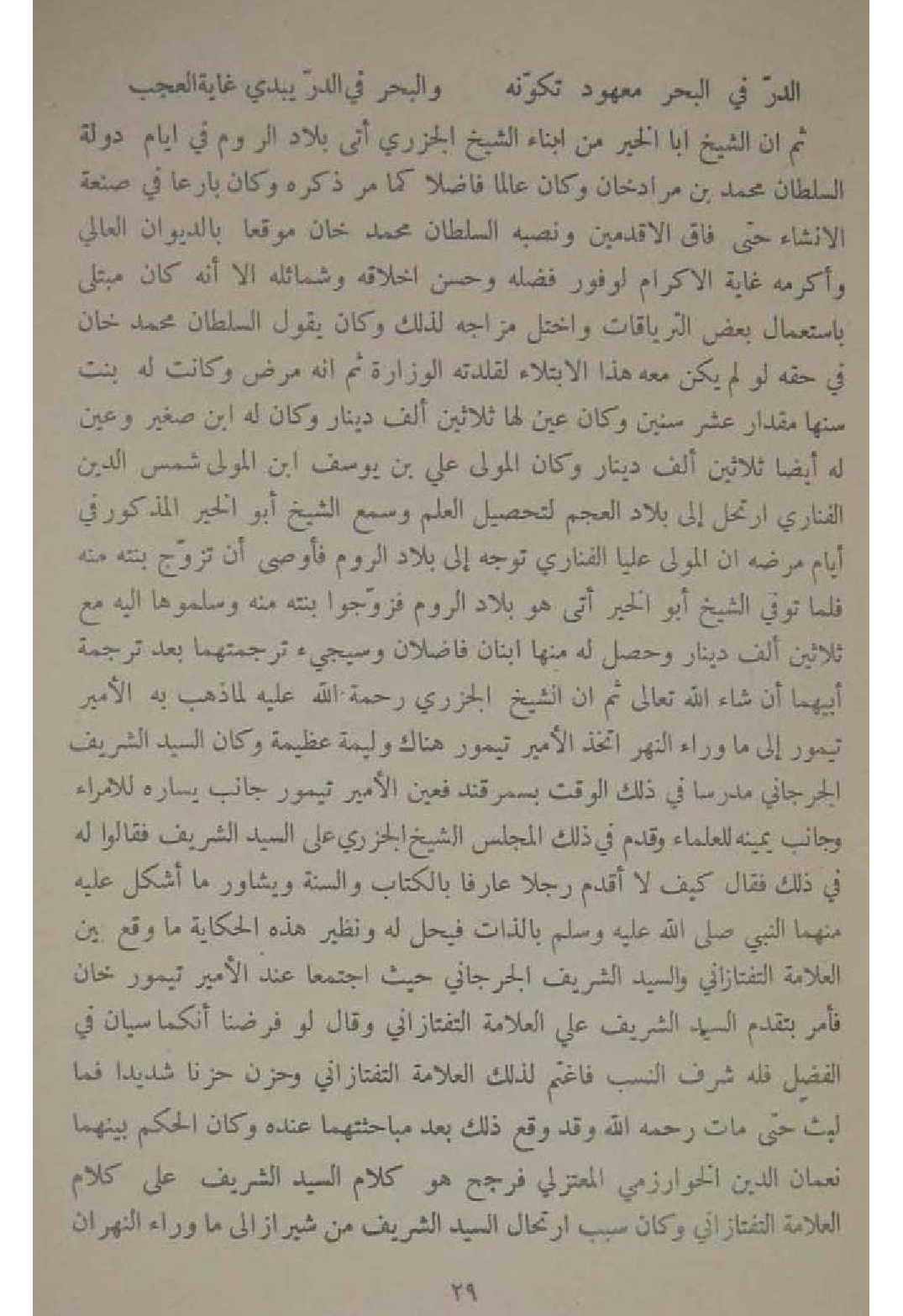 ثمَّ ان الشَّيْخ ابا الْخَيْر من ابناء الشَّيْخ الْجَزرِي اتى بِلَاد الرّوم فِي أَيَّام دولة السُّلْطَان مُحَمَّد بن مرادخان وَكَانَ عَالما فَاضلا كَمَا مر ذكره وَكَانَ بارعا فِي صنعه الانشاء حَتَّى فاق الاقدمين ونصبه السُّلْطَان مُحَمَّد خَان موقعا بالديوان العالي وأكرمه غَايَة الاكرام لوفور فَضله وَحسن اخلاقه وشمائله الا انه كَانَ مبتلي بِاسْتِعْمَال بعض الترياقات واختل مزاجه لذَلِك وَكَانَ يَقُول السُّلْطَان مُحَمَّد خَان فِي حَقه لَو لم يكن مَعَه هَذَا الِابْتِلَاء لقلدته الوزارة ثمَّ انه مرض وَكَانَ لَهُ بنت سنّهَا مِقْدَار عشر سِنِين وَكَانَ عين لَهَا ثَلَاثِينَ الف دِينَار وَكَانَ لَهُ ابْن صَغِير وَعين لَهُ ايضا ثَلَاثِينَ الف دِينَار وَكَانَ الْمولى عَليّ بن يُوسُف ابْن الْمولى شمس الدّين الفناري ارتحل الى بِلَاد الْعَجم لتَحْصِيل الْعلم وَسمع الشَّيْخ ابو الْخَيْر الْمَذْكُور فِي ايام مَرضه ان الْمولى عليا الفناري توجه الى بِلَاد الرّوم فاوصى ان تزوج بنته مِنْهُ فَلَمَّا توفّي الشَّيْخ ابو الْخَيْر اتى هُوَ بِلَاد الرّوم فزوجوا بنته مِنْهُ وسلموها اليه مَعَ ثَلَاثِينَ الف دِينَار وَحصل لَهُ مِنْهَا ابْنَانِ فاضلان وَسَيَجِيءُ ترجمتهما بعد تَرْجَمَة ابيهما ان شَاءَ الله تَعَالَى ثمَّ ان الشَّيْخ الْجَزرِي رَحْمَة الله عَلَيْهِ لما ذهب بِهِ الامير تيمور الى مَا وَرَاء النَّهر اتخذ الامير تيمور هُنَاكَ وَلِيمَة عَظِيمَة وَكَانَ السَّيِّد الشريف الْجِرْجَانِيّ مدرسا فِي ذَلِك الْوَقْت بسمرقند فعين الْأَمِير تيمور جَانب يسَاره للامراء وجانب يَمِينه للْعُلَمَاء وَقدم فِي ذَلِك الْمجْلس الشَّيْخ الْجَزرِي على السَّيِّد الشريف فَقَالُوا لَهُ فِي ذَلِك فَقَالَ كَيفَ لَا أقدم رجلا عَارِفًا بِالْكتاب وَالسّنة ويشاور مَا أشكل عَلَيْهِ مِنْهُمَا النَّبِي صلى الله عَلَيْهِ وَسلم بِالذَّاتِ فَيحل لَهُ وَنَظِير هَذِه الْحِكَايَة مَا وَقع بَين الْعَلامَة التَّفْتَازَانِيّ وَالسَّيِّد الشريف الْجِرْجَانِيّ حَيْثُ اجْتمعَا عندالامير تيمور خَان فَأمر بتقدم السَّيِّد الشريف عَليّ الْعَلامَة التَّفْتَازَانِيّ وَقَالَ لَو فَرضنَا انكما سيان فِي الْفضل فَلهُ شرف النّسَب فَاغْتَمَّ لذَلِك الْعَلامَة التَّفْتَازَانِيّ وحزن حزنا شَدِيدا فَمَا لبث حَتَّى مَاتَ رَحمَه الله وَقد وَقع ذَلِك بعد مباحثتهما عِنْده وَكَانَ الحكم بَينهمَا نعْمَان الدّين الْخَوَارِزْمِيّ المعتزلي فرجح هُوَ كَلَام السَّيِّد الشريف على كَلَام الْعَلامَة التَّفْتَازَانِيّ وَكَانَ سَبَب ارتحال السَّيِّد الشريف من شيراز الى مَا وَرَاء النهران
