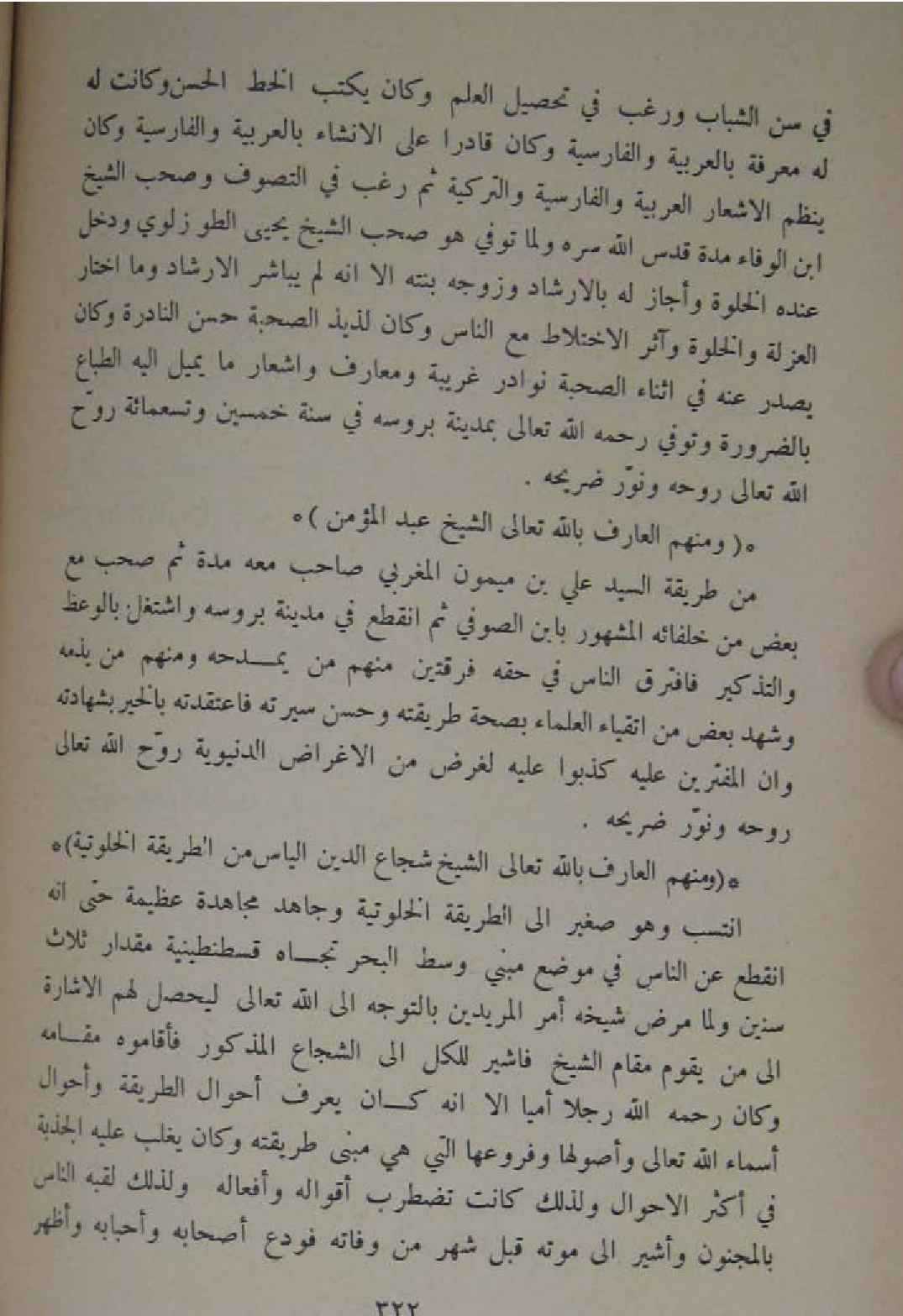 فِي سنّ الشَّبَاب وَرغب فِي تَحْصِيل الْعلم وَكَانَ يكْتب الْخط الْحسن وَكَانَت لَهُ معرفَة بِالْعَرَبِيَّةِ والفارسية وَكَانَ قَادِرًا على الانشاء بِالْعَرَبِيَّةِ والفارسية وَكَانَ ينظم الاشعار الْعَرَبيَّة والفارسية والتركية ثمَّ رغب فِي التصوف وَصَحب الشَّيْخ ابْن الْوَفَاء مُدَّة قدس الله سره وَلما توفّي هُوَ صحب الشَّيْخ يحيى الطوزلوي وَدخل عِنْده الْخلْوَة وَأَجَازَ لَهُ بالارشاد وزوجه بنته الا انه لم يُبَاشر الارشاد وَمَا اخْتَار الْعُزْلَة وَالْخلْوَة وآثر الِاخْتِلَاط مَعَ النَّاس وَكَانَ لذيذ الصعبة حسن النادرة وَكَانَ يصدر عَنهُ فِي أثْنَاء الصُّحْبَة نَوَادِر غَرِيبَة ومعارف وأشعار مَا يمِيل اليه الطباع بِالضَّرُورَةِ وَتُوفِّي رَحمَه الله تَعَالَى بِمَدِينَة بروسه فِي سنة خمسين وَتِسْعمِائَة روح الله تَعَالَى روحه وَنور ضريحه