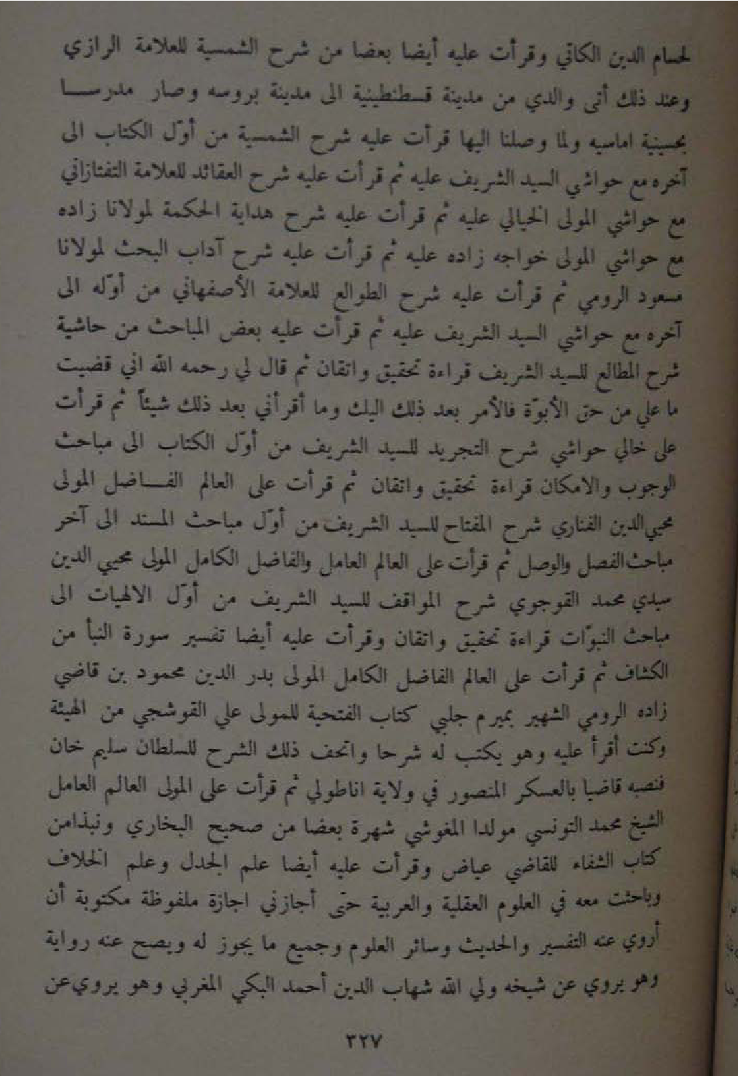 لحسام الدّين الكاتي وقرأت عَلَيْهِ ايضا بَعْضًا من شرح الشمسية للعلامة الرَّازِيّ وَعند ذَلِك أَتَى وَالِدي من مَدِينَة قسطنطينية الى مَدِينَة بروسه وَصَارَ مدرسا بحسينية اماسيه وَلما وصلنا اليها قَرَأت عَلَيْهِ شرح الشمسية من اول الْكتاب الى آخِره مَعَ حَوَاشِي السَّيِّد الشريف عَلَيْهِ ثمَّ قَرَأت عَلَيْهِ شرح العقائد للعلامة التَّفْتَازَانِيّ مَعَ حَوَاشِي الْمولى الخيالي عَلَيْهِ ثمَّ قَرَأت عَلَيْهِ شرح هِدَايَة الْحِكْمَة لمولانا زَاده مَعَ حَوَاشِي الْمولى خواجه زَاده عَلَيْهِ ثمَّ قَرَأت عَلَيْهِ شرح آدَاب الْبَحْث لمولانا مَسْعُود الرُّومِي ثمَّ قَرَأت عَلَيْهِ شرح الطوالع للعلامة الاصفهاني من اوله الى آخِره مَعَ حَوَاشِي السَّيِّد الشريف عَلَيْهِ ثمَّ قَرَأت عَلَيْهِ بعض المباحث من حَاشِيَة شرح الْمطَالع للسَّيِّد الشريف قِرَاءَة تَحْقِيق واتقان ثمَّ قَالَ لي رَحمَه الله اني قضيت مَا عَليّ من حق الابوة فَالْأَمْر بعد ذَلِك اليك وَمَا أَقْرَأَنِي بعد ذَلِك شَيْئا ثمَّ قَرَأت على خَالِي حَوَاشِي شرح التَّجْرِيد للسَّيِّد الشريف من اول الْكتاب الى مبَاحث الْوُجُوب والامكان قِرَاءَة تَحْقِيق واتقان ثمَّ قَرَأت على الْعَالم الْفَاضِل الْمولى محيي الدّين الفناري شرح الْمِفْتَاح للسَّيِّد الشريف من أول مبَاحث الْمسند الى آخر مبَاحث الْفَصْل والوصل ثمَّ قَرَأت على الْعَالم الْعَامِل والفاضل الْكَامِل الْمولى محيي الدّين سَيِّدي مُحَمَّد القوجوي شرح المواقف للسَّيِّد الشريف من أول الالهيات الى مبَاحث النبوات قِرَاءَة تَحْقِيق واتقان وقرأت عَلَيْهِ ايضا تَفْسِير سُورَة النبأ من الْكَشَّاف ثمَّ قَرَأت على الْعَالم الْفَاضِل الْكَامِل الْمولى بدر الدّين مَحْمُود بن قَاضِي زَاد الرُّومِي الشهير بميرم جلبي كتاب الفتحية للْمولى عَليّ القوشجي من الْهَيْئَة وَكنت أَقرَأ عَلَيْهِ وَهُوَ يكْتب لَهُ شرحا واتحف ذَلِك الشَّرْح للسُّلْطَان سليم خَان فنصبه قَاضِيا بالعسكر المصنور فِي ولَايَة اناطولي ثمَّ قَرَأت على الْمولى الْعَالم الْعَامِل الشَّيْخ مُحَمَّد التّونسِيّ مولدا المغوشي شهرة بَعْضًا من صَحِيح البُخَارِيّ ونبذا من كتاب الشِّفَاء للْقَاضِي عِيَاض وقرأت عَلَيْهِ ايضا علم الجدل وَعلم الْخلاف وباحثت مَعَه فِي الْعُلُوم الْعَقْلِيَّة والعربية حَتَّى أجازني اجازة ملفوظة مَكْتُوبَة ان اروي عَنهُ التَّفْسِير والْحَدِيث وَسَائِر الْعُلُوم وَجَمِيع مَا يجوز لَهُ وَيصِح عَنهُ رِوَايَة وَهُوَ يروي عَن شَيْخه ولي الله شهَاب الدّين احْمَد البكي المغربي وَهُوَ يروي عَن