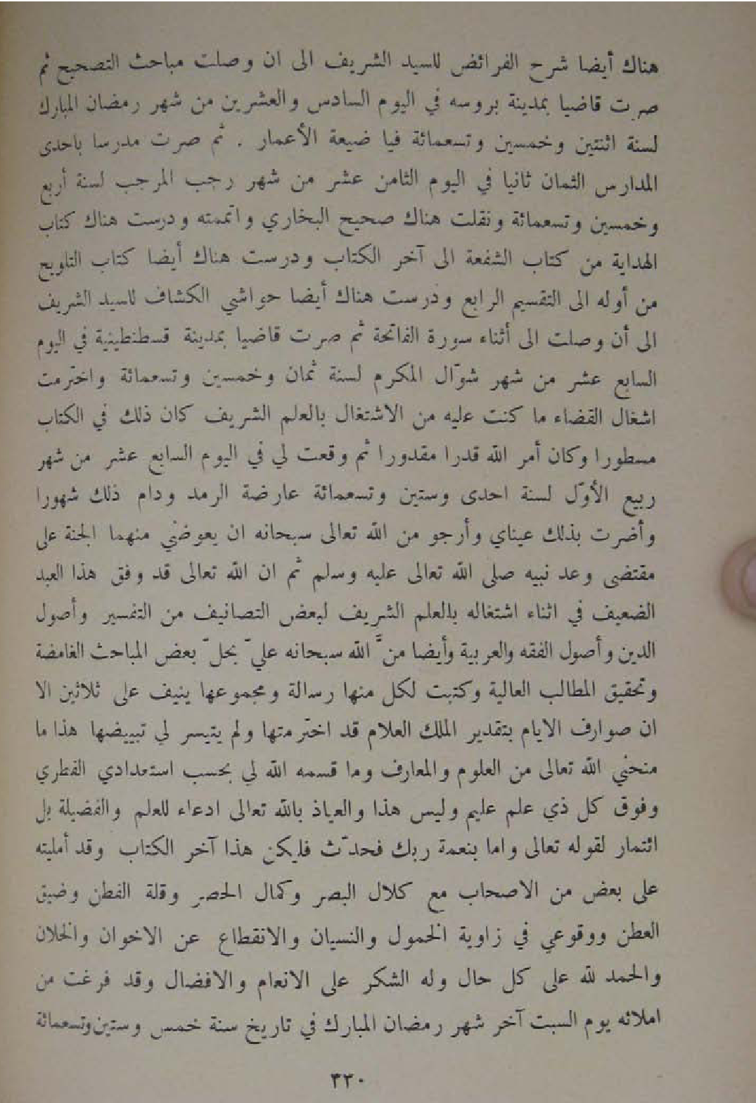هُنَاكَ ايضا شرح الْفَرَائِض للسَّيِّد الشريف الى ان وصلت مبَاحث التَّصْحِيح ثمَّ صرت قَاضِيا بِمَدِينَة بروسه فِي الْيَوْم السَّادِس وَالْعِشْرين من شهر رَمَضَان الْمُبَارك لسنة اثْنَتَيْنِ وَخمسين وَتِسْعمِائَة فيا ضَيْعَة الاعمار ثمَّ صرت مدرسا باحدى الْمدَارِس الثمان ثَانِيًا فِي الْيَوْم الثَّامِن عشر من شهر رَجَب المرجب لسنة ارْبَعْ وَخمسين وَتِسْعمِائَة ونقلت هُنَاكَ صَحِيح البُخَارِيّ واتممته ودرست هنك كتاب الْهِدَايَة من كتبا الشُّفْعَة الى آخر الْكتاب ودرست هُنَاكَ ايضا كتاب التَّلْوِيح من اوله الى التَّقْسِيم الرَّابِع ودرست هُنَاكَ ايضا حَوَاشِي الْكَشَّاف للسَّيِّد الشريف الى ان وصلت الى أثْنَاء سُورَة الْفَاتِحَة ثمَّ صرت قَاضِيا بِمَدِينَة قسطنطينية فِي الْيَوْم السَّابِع عشر من شهر شَوَّال المكرم لسنة ثَمَان وَخمسين وَتِسْعمِائَة واخترمت اشغال الْقَضَاء مَا كنت عَلَيْهِ من الِاشْتِغَال بِالْعلمِ الشريف كَانَ ذَلِك فِي الْكتاب مسطورا وَكَانَ أَمر الله قدرا مَقْدُورًا ثمَّ وَقعت لي فِي الْيَوْم السَّابِع عشر من شهر ربيع الاول لسنة احدى وَسِتِّينَ وَتِسْعمِائَة عارضة الرمد ودام ذَلِك شهورا وأضرت بذلك عَيْنَايَ وَأَرْجُو من الله تَعَالَى سُبْحَانَهُ ان يعوضني مِنْهُمَا الْجنَّة على مُقْتَضى وعد نبيه صلى الله تَعَالَى عَلَيْهِ وَسلم ثمَّ ان الله تَعَالَى قد وفْق هَذَا العَبْد الضَّعِيف فِي أثْنَاء اشْتِغَاله بِالْعلمِ الشريف لبَعض التصانيف من التَّفْسِير وأصول الدّين واصول الْفِقْه والعربية وايضا من الله سُبْحَانَهُ عَليّ بِحل بعض المباحث الغامضة وَتَحْقِيق المطالب الْعَالِيَة وكتبت لكل مِنْهَا رِسَالَة ومجموعها ينيف على ثَلَاثِينَ الا ان صوارف الايام بِتَقْدِير الْملك العلام قد اخترمتها وَلم يَتَيَسَّر لي تبييضها هَذَا مَا منحني الله تَعَالَى من الْعُلُوم والمعارف وَمَا قسمه الله لي بِحَسب استعدادي الفطري وَفَوق كل ذِي علم عليم وَلَيْسَ هَذَا وَالْعِيَاذ بِاللَّه تَعَالَى ادِّعَاء للْعلم والفضيلة بل ائتمار لقَوْله تَعَالَى واما بِنِعْمَة رَبك فَحدث فَلْيَكُن هَذَا آخر الْكتاب وَقد أمليته على بعض من الاصحاب مَعَ كلال الْبَصَر وَكَمَال الْحصْر وَقلة الفطن وضيق العطن ووقوعي فِي زَاوِيَة الخمول وَالنِّسْيَان والانقطاع عَن الاخوان والخلان وَالْحَمْد لله على كل حَال وَله الشُّكْر على الانعام والافضال وَقد فرغت من املائه يَوْم السبت آخر شهر رَمَضَان الْمُبَارك فِي تَارِيخ سنة خمس وَسِتِّينَ وَتِسْعمِائَة