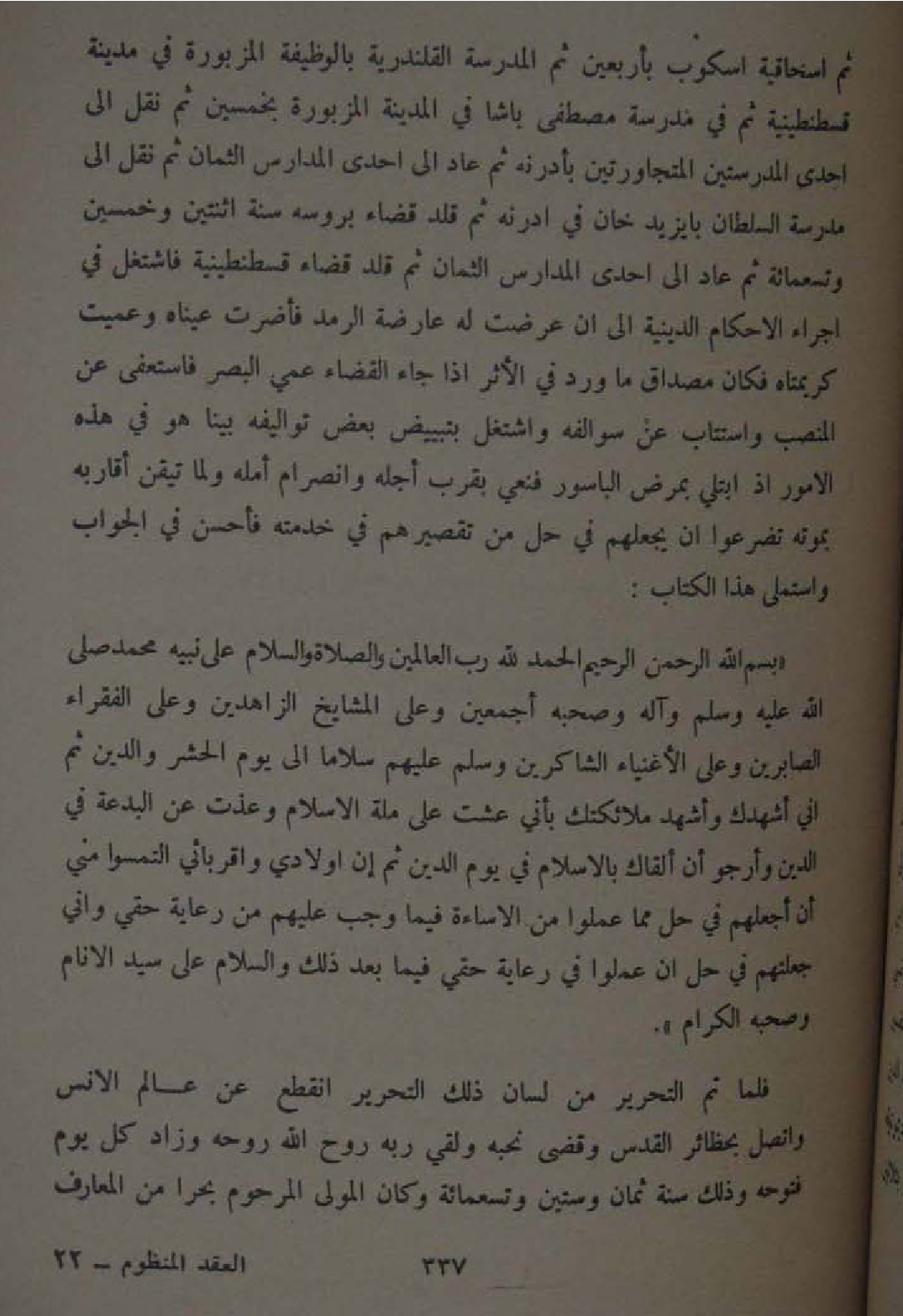 ثمَّ اسحاقية اسكوب بِأَرْبَعِينَ ثمَّ الْمدرسَة القلندرية بالوظيفة المزبورة فِي مَدِينَة قسطنطينية ثمَّ فِي مدرسة مصطفى باشا فِي الْمَدِينَة المزبروة بِخَمْسِينَ ثمَّ نقل الى احدى المدرستين المتجاورتين بأدرنه ثمَّ عَاد الى احدى الْمدَارِس الثمان ثمَّ نقل الى مدرسة السُّلْطَان بايزيدخان فِي أدرنه ثمَّ قلد قَضَاء بروسه سنة اثْنَتَيْنِ وَخمسين وَتِسْعمِائَة ثمَّ عَاد الى احدى الْمدَارِس الثمان ثمَّ قلد قَضَاء قسطنطينية فاشتغل فِي اجراء الاحكام الدِّينِيَّة الى ان عرضت لَهُ عارضة الرمد فاضرت عَيناهُ وعميت كريمتاه فَكَانَ مصداق مَا ورد فِي الاثر اذا جَاءَ الْقَضَاء عمي الْبَصَر فاستعفى عَن المنصب واستتاب عَن سوالفه واشتغل بتبييض بعض تواليفه بَينا هُوَ فِي هَذِه الامور اذ ابتلى بِمَرَض الْبَاسُور فنعي بِقرب اجله وانصرام امله وَلما تَيَقّن اقاربه بِمَوْتِهِ تضرعوا ان يجعلهم فِي حل من تقصيرهم فِي خدمته فاحسن فِي الْجَواب واستملى هَذَا الْكتاب بِسم الله الرَّحْمَن الرَّحِيم الْحَمد لله رب الْعَالمين وَالصَّلَاة وَالسَّلَام على نبيه مُحَمَّد صلى الله عَلَيْهِ وَسلم وَله وَصَحبه اجمعين وعَلى الْمَشَايِخ الزاهدين وعَلى الْفُقَرَاء الصابرين وعَلى الاغنياء الشَّاكِرِينَ وَسلم عَلَيْهِم سَلاما الى يَوْم الْحَشْر وَالدّين ثمَّ اني اشهدك وَأشْهد ملائكتك بِأَنِّي عِشْت على مِلَّة الاسلام وعذت عَن الْبِدْعَة فِي الدّين وَأَرْجُو ان أَلْقَاك بالاسلام فِي يَوْم الدّين ثمَّ ان اولادي واقربائي التمسوا مني ان اجعهلم فِي حل مِمَّا عمِلُوا من الاساءة فِيمَا وَجب عَلَيْهِم من رِعَايَة حَقي واني جعلتهم فِي حل ان عمِلُوا فِي رِعَايَة حَقي فِيمَا بعد ذَلِك وَالسَّلَام على سيدالانام وصحبة الْكِرَام فَلَمَّا تمّ التَّحْرِير من لِسَان ذَلِك التَّحْرِير انْقَطع عَن عَالم الانس واتصل بحظائر الْقُدس وَقضى نحبه وَلَقي ربه روح الله روحه وَزَاد كل يَوْم فتوحه وَذَلِكَ سنة ثَمَان وَسِتِّينَ وَتِسْعمِائَة وَكَانَ الْمولى المرحوم بحرا من المعارف