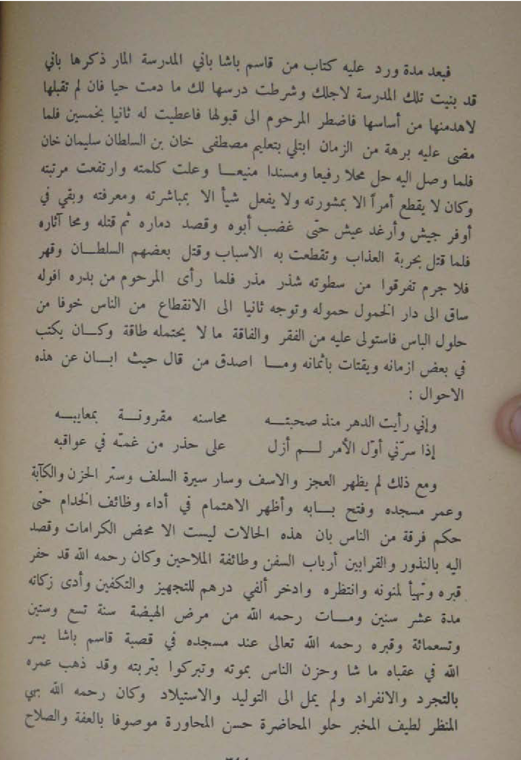 فَبعد مُدَّة ورد عَلَيْهِ كتاب من قَاسم باشا باني الْمدرسَة الْمَار ذكرهَا باني قد بنيت تِلْكَ الْمدرسَة لاجلك وشرطت درسها لَك مَا دمت حَيا فان لم تقبلهَا لاهدمنها من اساسها فاضطر المرحوم الى قبُولهَا فاعطيت لَهُ ثَانِيًا بِخَمْسِينَ فَلَمَّا مضى عَلَيْهِ بُرْهَة من الزَّمَان ابْتُلِيَ بتعليم مصطفى خَان بن السُّلْطَان سُلَيْمَان خَان فَلَمَّا وصل اليه حل محلا رفيعا وَمُسْندًا منيعا وعلت كَلمته وَارْتَفَعت مرتبته وَكَانَ لَا يقطع امرا الا بمشورته وَلَا يفعل شيأ الا بمباشرته ومعرفته وَبَقِي فِي اوفر جَيش وارغد عَيْش حَتَّى غضب ابوه وَقصد دماره ثمَّ قَتله ومحا آثاره فَلَمَّا قتل بِحَرْبَة الْعَذَاب وتقطعت بِهِ الاسباب وَقتل بَعضهم السُّلْطَان وقهر فَلَا جرم تفَرقُوا من سطوته شذر مذر فَلَمَّا رأى المرحوم من بدره افوله سَاق الى دَار الخمول حموله وَتوجه ثَانِيًا الى الِانْقِطَاع من النَّاس خوفًا من حُلُول الباس فاستولى عَلَيْهِ من الْفقر والفاقة مَالا يحْتَملهُ طَاقَة وَكَانَ يكْتب فِي بعض ازمانه ويقتات باثمانه وَمَا اصدق من قَالَ حَيْثُ ابان عَن هَذِه الاحوال ... واني رَأَيْت الدَّهْر مُنْذُ صحبته ... محاسنه مقرونة بمعايبه