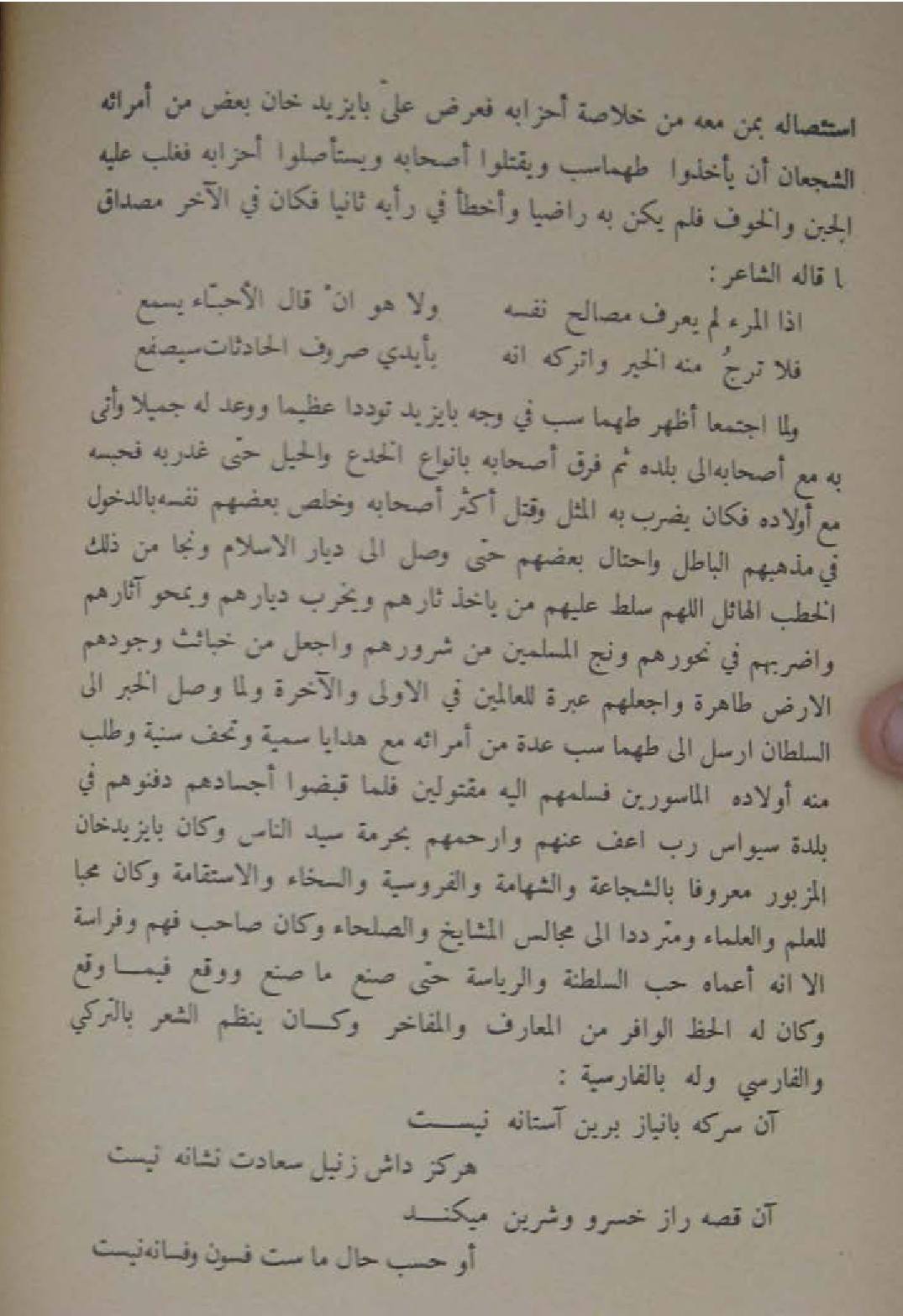 وَلما اجْتمعَا اظهر طهماسب فِي وَجه بايزيد توددا عَظِيما ووعد لَهُ جميلا وأتى بِهِ مَعَ اصحابه الى بَلَده ثمَّ فرق اصحابه بانواع الخدع والحيل حَتَّى غدربه فحبسه مَعَ اولاده فَكَانَ يضْرب بِهِ الْمثل وَقتل اكثر اصحابه وخلص بَعضهم نَفسه بِالدُّخُولِ فِي مَذْهَبهم الْبَاطِل واحتال بَعضهم حَتَّى وصل الى ديار الاسلام وَنَجَا من ذَلِك الْخطب الهائل اللَّهُمَّ سلط عَلَيْهِم من يَأْخُذ ثارهم وَيخرب دِيَارهمْ ويمحو آثَارهم واضربهم فِي نحورهم ونج الْمُسلمين من شرورهم وَاجعَل من خبائث وجودهم الارض طَاهِرَة واجعلهم عِبْرَة للْعَالمين فِي الاولى والاخرة وَلما وصل الْخَبَر الى السُّلْطَان ارسل الى طهماسب عدَّة من امرائه مَعَ هَدَايَا سميَّة وتحف سنية وَطلب مِنْهُ اولاده الماسورين فسلمهم اليه مقتولين فَلَمَّا قبضوا اجسادهم دفنوهم فِي بَلْدَة سيواس رب اعْفُ عَنْهُم وارحمهم بِحرْمَة سيدالناس وَكَانَ بايزيدخان الْمَزْبُور مَعْرُوفا بالشجاعة والشهامة والفروسية والسخاء والاستقامة وَكَانَ محبا للْعلم وَالْعُلَمَاء ومترددا الى مجَالِس الْمَشَايِخ والصلحاء وَكَانَ صَاحب فهم وفراسة الا انه أعماه حب السلطنة والرياسة حَتَّى صنع مَا صنع وَوَقع فِيمَا وَقع وَكَانَ لَهُ الْحَظ الوافر من المعارف والمفاخر وَكَانَ ينظم الشّعْر بالتركي والفارسي وَله بِالْفَارِسِيَّةِ ... آن سركه بانياز برين آستانه نيست ... هركز داش زنيل سعادت نشانه نيست