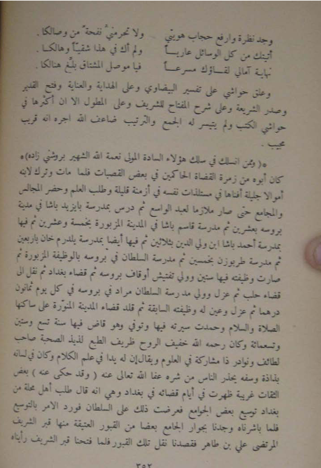 وعلق حَوَاشِي على تَفْسِير الْبَيْضَاوِيّ وعَلى الْهِدَايَة والعناية وَفتح الْقَدِير وَصدر الشَّرِيعَة وعَلى شرح الْمِفْتَاح للشريف وعَلى المطول الا ان اكثرها فِي حَوَاشِي الْكتب وَلم يَتَيَسَّر لَهُ الْجمع وَالتَّرْتِيب ضاعف الله اجره انه قريب مُجيب ... وَمِمَّنْ انسلك فِي سلك هَؤُلَاءِ السَّادة الْمولى نعْمَة الله الشهير بروشني زَاده ... كَانَ أَبوهُ من زمرة الْقُضَاة الْحَاكِمين فِي بعض القصبات فَلَمَّا مَاتَ وَترك لِابْنِهِ اموالا جليلة افناها فِي مستلذات نَفسه فِي أزمنة قَليلَة وَطلب الْعلم وَحضر الْمجَالِس والمجامع حَتَّى صَار ملازما لعبد الْوَاسِع ثمَّ درس بمدرسة بايزيدباشا فِي مَدِينَة بروسه بِعشْرين ثمَّ مدرسة قَاسم باشا فِي الْمَدِينَة المزبورة بِخَمْسَة وَعشْرين ثمَّ فِيهَا بمدرسة احْمَد باشا ابْن ولي الدّين بِثَلَاثِينَ ثمَّ فِيهَا ايضا بمدرسة يلدرم خَان باربعين ثمَّ مدرسة طربوزن بِخَمْسِينَ ثمَّ مدرسة السُّلْطَان فِي بروسه بالوظيفة المزبورة ثمَّ صَارَت وظيفته فِيهَا سِتِّينَ وَولي تفتيش اوقاف بروسه ثمَّ قَضَاء بَغْدَاد ثمَّ نقل الى قَضَاء حلب ثمَّ عزل وَولي مدرسة السُّلْطَان مُرَاد فِي بروسه فِي كل يَوْم ثَمَانُون درهما ثمَّ عزل وَعين لَهُ وظيفته السَّابِقَة ثمَّ قلد قَضَاء الْمَدِينَة المنورة على ساكنها الصَّلَاة وَالسَّلَام وحمدت سيرته فِيهَا وَتُوفِّي وَهُوَ قَاض فِيهَا سنة تسع وَسِتِّينَ وَتِسْعمِائَة وَكَانَ رَحمَه الله خَفِيف الرّوح ظريف الطَّبْع لذيذ الصُّحْبَة صَاحب لطائف ونوادر ذَا مُشَاركَة فِي الْعُلُوم وَيُقَال ان لَهُ يدا فِي علم الْكَلَام وَكَانَ فِي لِسَانه بذاذة وسفه يحذر النَّاس من شَره عَفا الله تَعَالَى عَنهُ وَقد حكى عَنهُ بعض الثِّقَات غَرِيبَة ظَهرت فِي أَيَّام قَضَائِهِ فِي بَغْدَاد وَهِي انه قَالَ طلب اهل محلّة من بَغْدَاد توسيع بعض الْجَوَامِع فعرضت ذَلِك على السُّلْطَان فورد الامر بالتوسيع فَلَمَّا باشرناه وجدنَا بجوار الْجَامِع بَعْضًا من الْقُبُور العتيقة مِنْهَا قبر الشريف المرتضى عَليّ بن طَاهِر فقصدنا نقل تِلْكَ الْقُبُور فَلَمَّا فتحنا قبر الشريف رَأَيْنَاهُ
