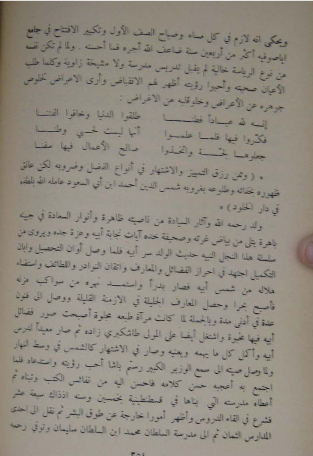 ولد رَحمَه الله وآثار السِّيَادَة من ناصيته ظَاهِرَة وأنوار السَّعَادَة فِي جَبينه باهرة يُتْلَى من بَيَاض غرته وصحيفة خَدّه آيَات نجابة ابيه وَعزة جده ويروى من سلسلة هَذَا النجل النبيه حَدِيث الْوَلَد سر ابيه فَلَمَّا وصل اوان التَّحْصِيل وَأَبَان التَّكْمِيل اجْتهد فِي احراز الْفَضَائِل والمعارف واتقان النَّوَادِر واللطائف واستضاء هلاله من شمس ابيه فَصَارَ بَدْرًا واستمد نهره من سواكب مزنه فَأصْبح بحرا وَحصل المعارف الجليلة فِي الازمنة القليلة وَوصل الى فنون عدَّة فِي ادنى مُدَّة وَبِالْجُمْلَةِ لما كَانَت مرْآة طبعه مجلوة اصبحت صور فَضَائِل ابيه فِيهَا مخبوة واشتغل ايضا على الْمولى طاشكبري زَاده ثمَّ صَار معيد الدَّرْس ابيه واكمل كل مَا يهمه ويعنيه وَصَارَ فِي الاشتهار كَالشَّمْسِ فِي وسط النَّهَار وَلما وصل صيته الى سمع الْوَزير الْكَبِير رستم باشا احب رُؤْيَته واستدعاه فَلَمَّا اجْتمع بِهِ اعجبه حسن كَلَامه فاحسن اليه من نفائس الْكتب وتبناه ثمَّ اعطاه مدرسته الَّتِي بناها فِي قسطنطينية بِخَمْسِينَ وسنه اذ ذَاك سَبْعَة عشر فشرع فِي القاء الدُّرُوس واظهر امورا خَارِجَة عَن طوق الْبشر ثمَّ نقل الى احدى الْمدَارِس الثمان ثمَّ الى مدرسة السُّلْطَان مُحَمَّد ابْن السُّلْطَان سُلَيْمَان وَتُوفِّي رَحمَه