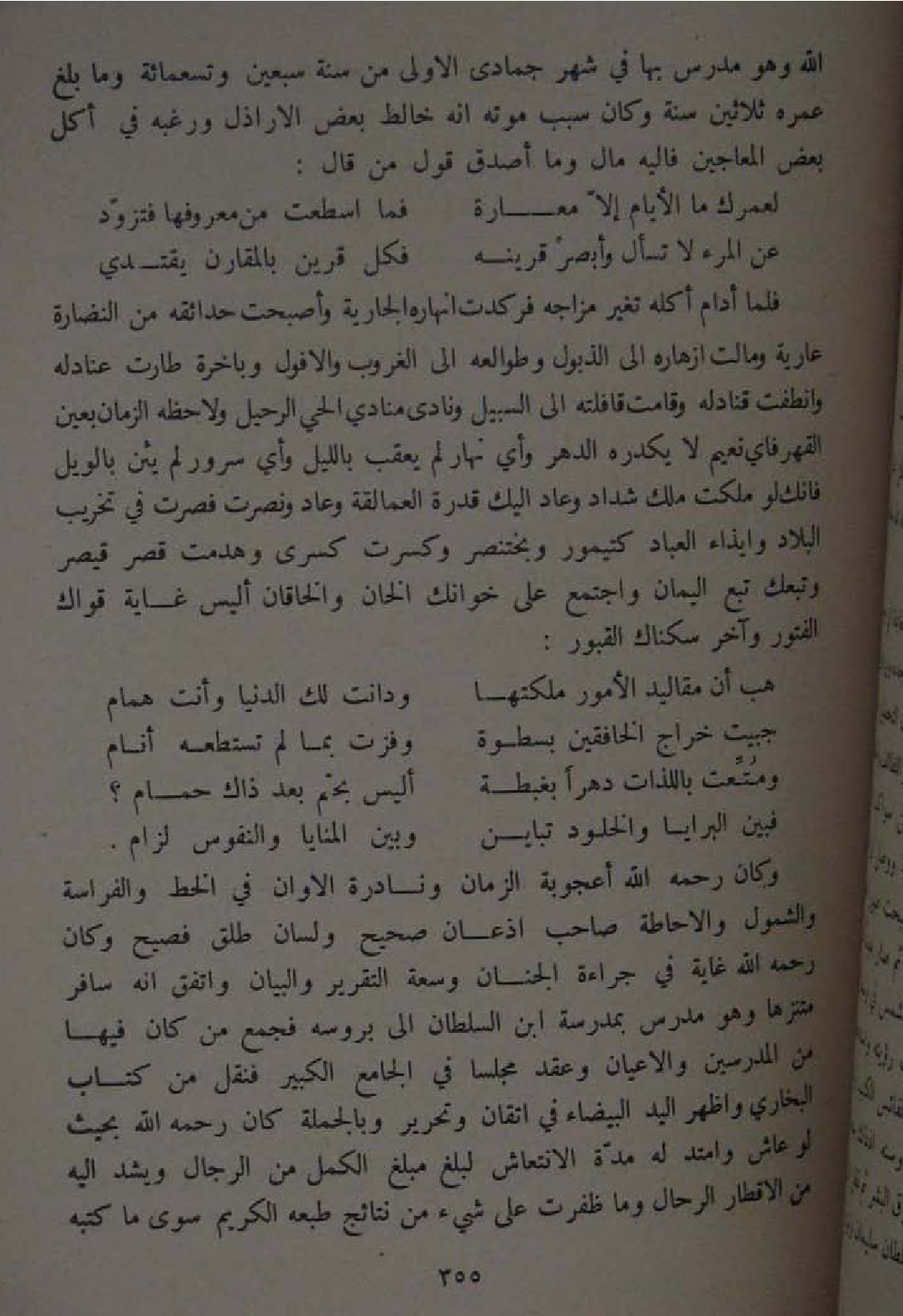 الله وَهُوَ مدرس بهَا فِي شهر جُمَادَى الاولى من سنة سبعين وَتِسْعمِائَة وَمَا بلغ عمره ثَلَاثِينَ سنة وَكَانَ سَبَب مَوته انه خالط بعض الاراذل ورغبه فِي اكل بعض المعاجين فاليه وَمَا اصدق قَول من قَالَ ... لعمرك مَا الايام الا معارة ... فَمَا اسطعت من معروفها فتزود