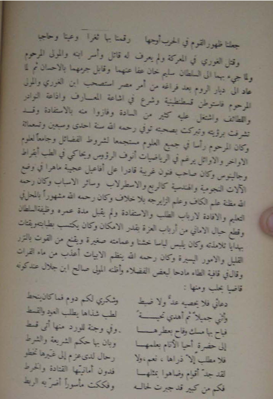 وَقتل الغوري فِي المعركة وَلم يعرف لَهُ قَاتل واسر ابْنه وَالْمولى المرحوم وَلما جِيءَ بهما الى السُّلْطَان سليم خَان عَفا عَنْهُمَا وقابل جرمهما بالاحسان ثمَّ لما عَاد الى ديار الرّوم بعد فَرَاغه من أَمر مصر استصحب ابْن الغوري وَالْمولى المرحوم فاستطوطن قسطنطينية وَشرع فِي اشاعة المعارف واذاعة النَّوَادِر واللطائف واشتغل عَلَيْهِ كثير من السَّادة وفازوا مِنْهُ بالاستفادة وَقد تشرفت بِرُؤْيَتِهِ وتبركت بِصُحْبَتِهِ توفّي رَحمَه الله سنة احدى وَسبعين وَتِسْعمِائَة وَكَانَ المرحوم رَأْسا فِي جَمِيع الْعُلُوم مستجمعا لشروط الْفَضَائِل وجامعا لعلوم الاواخر والاوائل يرغم فِي الرياضيات انوف الرؤوس ويحاكي فِي الطِّبّ ابقراط وجالينوس وَكَانَ صَاحب فنون غَرِيبَة قَادِرًا على افاعيل عَجِيبَة ماهرا فِي وضع الالات النجومية والهندسية كالربع والاسطرلاب وَسَائِر الاسباب وَكَانَ رَحمَه الله مَظَنَّة علم الْكَاف وَعلم الزايرجه بِلَا خلاف وَكَانَ رَحمَه الله مَشْهُورا بِالْمحل فِي التَّعْلِيم والافادة لارباب الطّلب والاستفادة وَلم يقبل مُدَّة عمره وَظِيفَة السُّلْطَان وَقطع حبال الاماني من ارباب الْعِزَّة بِقدر الامكان وَكَانَ يكْتَسب بطبابته ويقتات بِهَدَايَا تلامذته وَكَانَ يلبس لباسا خشنا عمَامَته صَغِيرَة ويقنع من الْقُوت بالنزر الْقَلِيل والامور الْيَسِيرَة وَكَانَ رَحمَه الله ينظم الابيات اعذب من مَاء الْفُرَات وَقَالَ فِي قافية الطَّاء مادحا لبَعض الْفُضَلَاء وَأَظنهُ الْمولى صَالح ابْن جلال عِنْد كَونه قَاضِيا بحلب وَمِنْهَا ... دعائي فَلَا يُحْصِيه عد وَلَا ضبط ... وشكري لكم دوم فَمَا كَانَ ينحط