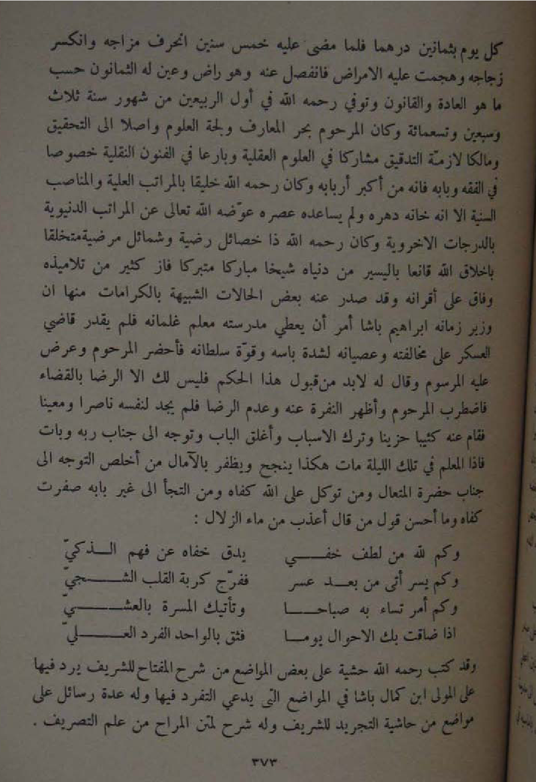 كل يَوْم بِثَمَانِينَ درهما فَلَمَّا مضى عَلَيْهِ خمس سِنِين انحرف مزاجه وانكسر زجاجه وهجمت عَلَيْهِ الامراض فانفصل عَنهُ وَهُوَ رَاض وَعين لَهُ الثَّمَانُونَ حسب مَا هُوَ الْعَادة والقانون وَتُوفِّي رَحمَه الله فِي اول الربيعين من شهور سنة ثَلَاث وَسبعين وَتِسْعمِائَة وَكَانَ المرحوم بَحر المعارف ولجة الْعُلُوم واصلا الى التَّحْقِيق ومالكا لَازِمَة التدقيق مشاركا فِي الْعُلُوم الْعَقْلِيَّة وبارعا فِي الْفُنُون النقلية خُصُوصا فِي الْفِقْه وبابه فانه من اكبر اربابه وَكَانَ رَحمَه الله خليقا بالمرتب الْعلية والمناصب السّنيَّة الا انه خانه دهره وَلم يساعده عصره عوضه الله تَعَالَى عَن الْمَرَاتِب الدُّنْيَوِيَّة بالدرجات الاخروية وَكَانَ رَحمَه الله ذَا خصائل رضية وشمائل مرضية متخلقا باخلاق الله قانعا باليسير من دُنْيَاهُ شَيخا مُبَارَكًا متبركا فَازَ كثير من تلاميذه وفَاق على أقرانه وَقد صدر عَنهُ بعض الْحَالَات الشبيهة بالكرامات مِنْهَا ان وَزِير زَمَانه إِبْرَاهِيم باشا امْر ان يُعْطي مدرسته معلم غلمانه فَلم يقدر قَاضِي الْعَسْكَر على مُخَالفَته وعصيانه لشدَّة باسه وَقُوَّة سُلْطَانه فأحضر المرحوم وَعرض عَلَيْهِ المرسوم وَقَالَ لَهُ لَا بُد من قبُول هَذَا الحكم فَلَيْسَ لَك الا الرِّضَا بِالْقضَاءِ فاضطرب المرحوم واظهر النفرة عَنهُ وَعدم الرِّضَا فَلم يجد لنَفسِهِ ناصرا ومعينا فَقَامَ عَنهُ كئيبا حَزينًا وَترك الاسباب وأغلق الْبَاب وَتوجه الى جناب ربه وَبَات فَإِذا الْمعلم فِي تِلْكَ اللَّيْلَة مَاتَ هَكَذَا ينجح ويظفر بالامال من اخلص التَّوَجُّه الى جناب حَضْرَة المتعال وَمن توكل على الله كَفاهُ وَمن التجأ الى غير بَابه صفرت كَفاهُ وَمَا احسن قَول من قَالَ اعذب من مَاء الزلَال ... وَكم لله من لطف خَفِي ... يدق خفاه عَن فهم الذكي