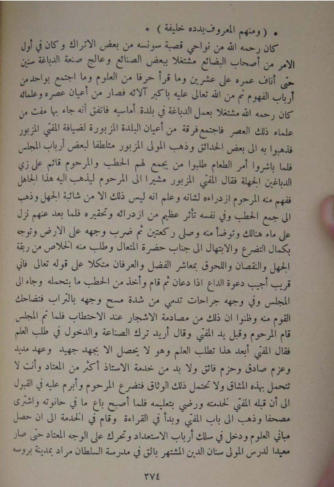 كَانَ رَحمَه الله من نواحي قَصَبَة سونسه من بعض الاتراك وَكَانَ فِي اول الامر من أَصْحَاب البضائع مشتغلا بِبَعْض الصَّنَائِع وعالج صَنْعَة الدباغة سِنِين حَتَّى أناف عمره على عشْرين وَمَا قرا حرفا من الْعُلُوم وَمَا اجْتمع بِوَاحِد من ارباب الفهوم ثمَّ من الله تَعَالَى عَلَيْهِ بأكبر آلائه فَصَارَ من أَعْيَان عصره وعلمائه كَانَ رَحمَه الله مشتغلا بِعَمَل الدباغة فِي بَلْدَة أماسيه فاتفق انه جَاءَ بهَا مفت من عُلَمَاء ذَلِك الْعَصْر فَاجْتمع فرقة من أَعْيَان الْبَلدة المزبورة لضيافة الْمُفْتِي الْمَزْبُور فَذَهَبُوا بِهِ الى بعض الحدائق وَذهب الْمولى الْمَزْبُور متلطفا لبَعض ارباب الْمجْلس فَلَمَّا باشروا أَمر الطَّعَام طلبُوا من يجمع لَهُم الْحَطب والمرحوم قَائِم على زِيّ الدباغين الجهلة فَقَالَ الْمُفْتِي الْمَزْبُور مُشِيرا الى المرحوم ليذْهب اليه هَذَا الْجَاهِل ففهم مِنْهُ المرحوم ازدراءه لشأنه وَعلم انه لَيْسَ ذَلِك الا من شَائِبَة الْجَهْل وَذهب الى جمع الْحَطب وَفِي نَفسه تأثر عَظِيم من ازدرائه وتحقيره فَلَمَّا بعدعنهم نزل على مَاء هُنَالك وتوضا مِنْهُ وَصلى رَكْعَتَيْنِ ثمَّ ضرب وَجهه على الارض وَتوجه بِكَمَال التضرع والابتهال الى جناب حَضْرَة المتعال وَطلب مِنْهُ الْخَلَاص من ربقة الْجَهْل وَالنُّقْصَان واللحوق بمعاشر الْفضل والعرفان متكلا على قَوْله تَعَالَى فَانِي قريب اجيب دَعْوَة الداع اذا دعان ثمَّ قَامَ وَأخذ من الْحَطب مَا يتحمله وَجَاء الى الْمجْلس وَفِي وَجهه جراحات تدمي من شدَّة مسح وَجهه بِالتُّرَابِ فتضاحك الْقَوْم مِنْهُ وظنوا ان ذَلِك من مصادمة الاشجار عندالاحتطاب فَلَمَّا تمّ الْمجْلس قَامَ المرحوم وَقبل يَد المتفي وَقَالَ اريد ترك الصِّنَاعَة وَالدُّخُول فِي طلب الْعلم فَقَالَ الْمُفْتِي ابعد هَذَا تطلب الْعلم وَهُوَ لَا يحصل الا بِجهْد جهيد وعهد مديد وعزم صَادِق وحزم فائق وَلَا بُد من خدمَة الاستاذ اكثر من الْمُعْتَاد وَأَنت لَا تتحمل بِهَذِهِ المشاق وَلَا تحْتَمل ذَلِك الوثاق فتضرع المرحوم وأبرم عَلَيْهِ فِي الْقبُول الى ان قبله الْمُفْتِي لخدمته وَرَضي بتعليمه فَلَمَّا اصبح بَاعَ مَا فِي حانوته وَاشْترى مُصحفا وَذهب الى بَاب الْمُفْتِي وَبَدَأَ فِي الْقِرَاءَة وَقَامَ فِي الْخدمَة الى ان حصل مباني الْعُلُوم وَدخل فِي سلك ارباب الاستعداد وتحرك على الْوَجْه الْمُعْتَاد حَتَّى صَار معيدا لدرس الْمولى سِنَان الدّين المشتهر بالق فِي مدرسة السُّلْطَان مُرَاد بِمَدِينَة بروسه