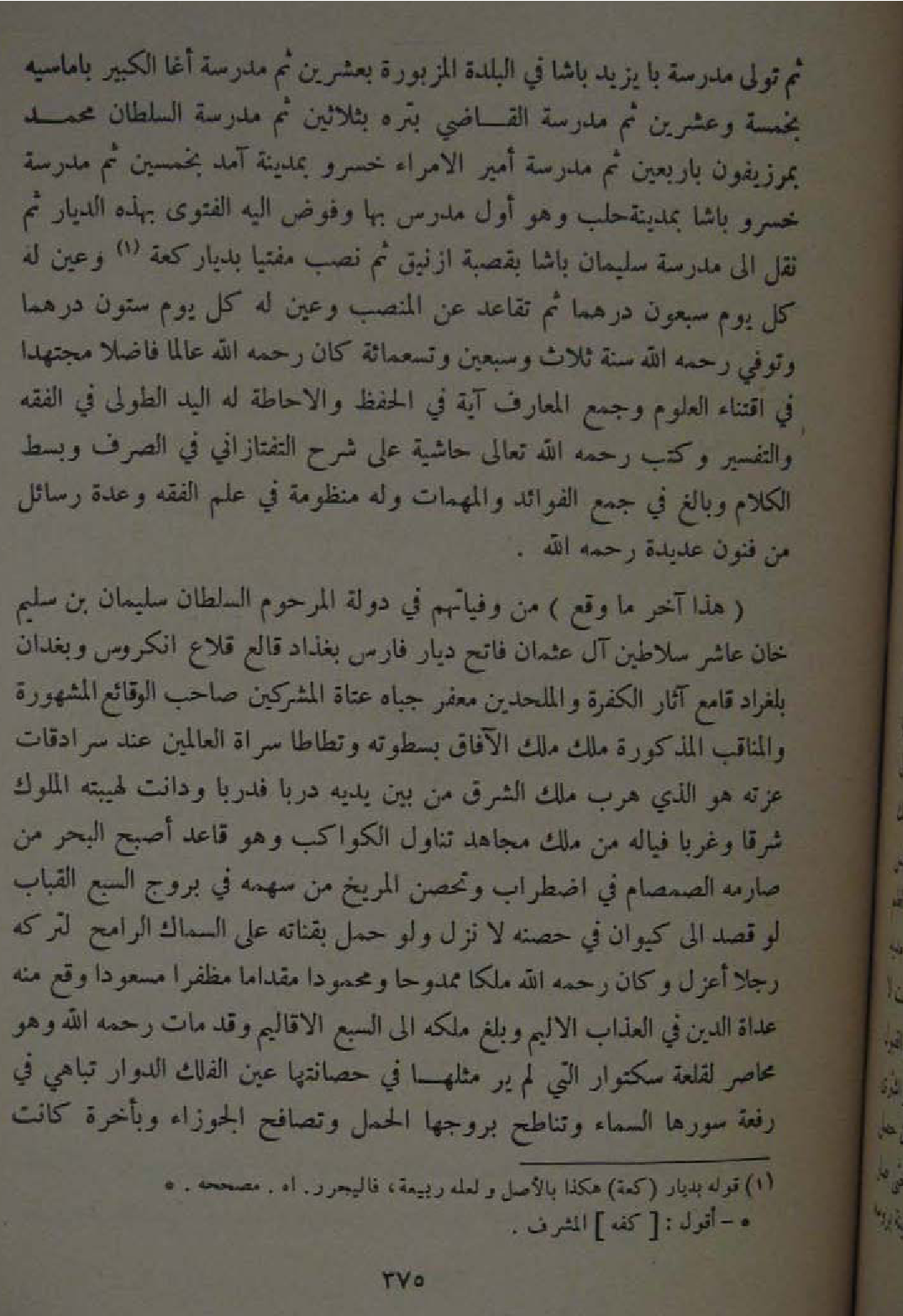 هَذَا آخر مَا وَقع من وفياتهم فِي دولة المرحوم السُّلْطَان سُلَيْمَان بن سليم خَان عَاشر سلاطين آل عمثان فاتح ديار فَارس بغذاد قالع قلاع انكروس وبغدان بلغراد قامع آثَار الْكَفَرَة والملحدين معفر جباه عتاة الْمُشْركين صَاحب الوقائع الْمَشْهُورَة والمناقب الْمَذْكُورَة ملك ملك الافاق بسطوته وتطاطا سراة الْعَالمين عِنْد سرادقات عزته هُوَ الَّذِي هرب ملك الشرق من بَين يَدَيْهِ فدربا فربا ودانت لهيبته الْمُلُوك شرقا وغربا فياله من ملك مُجَاهِد تنَاول الْكَوَاكِب وَهُوَ قَاعد اصبح الْبَحْر من صارمه الصمصام فِي اضْطِرَاب وتحصن المريخ من سَهْمه فِي بروج السَّبع القباب لَو قصد الى كيوان فِي حصنه لَا نزل وَلَو حمل بقناته على السماك الرامح لتَركه رجلا اعزل وَكَانَ رَحمَه الله ملكا ممدوحا ومحمودا مقداما مظفرا مسعودا وَقع مِنْهُ عداة الدّين فِي الْعَذَاب الاليم وَبلغ ملكه الى السَّبع الاقاليم وَقد مَاتَ رَحمَه الله وَهُوَ محاصر لقلعة سكتوار الَّتِي لم ير مثلهَا فِي حصانتها عين الْفلك الدوار تباهي فِي رفْعَة سورها السَّمَاء وتناطح بروجها الْحمل وتصافح الجوزاء وبأخرة كَانَت